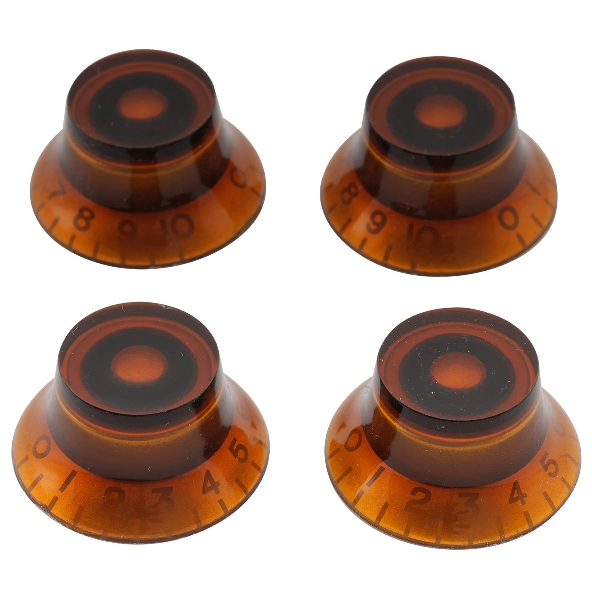 トップハットベルのビンテージスタイルのノブ、レスポールスタイルのギター、最も似たギター 主に輸入スタイルとアジア製(中国、韓国、日本)の6ミリ(1/4インチ)直径のスプリットシャフトポット用メトリックサイズ。フェンダー、CTS、ディマジオポットのようなインチサイズのポットはありません 材質:プラスチック 色:アンバー パッケージが含まれています:4×ギターノブ
