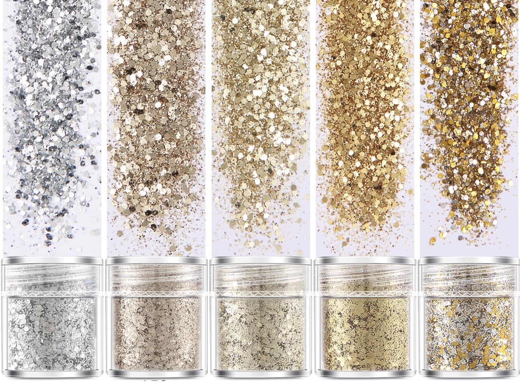 Coollooda グリッター 容器入り キラキラ ネイルパーツ ネイルアート ネイルタウン ラメグリッター ラメパウダー ヘア飾り 顔 ボディ クリスマス 新年 パーティー 5個セット (ゴールド セット1mm&パウダーミクスサイズ) (ゴールドシリーズ)