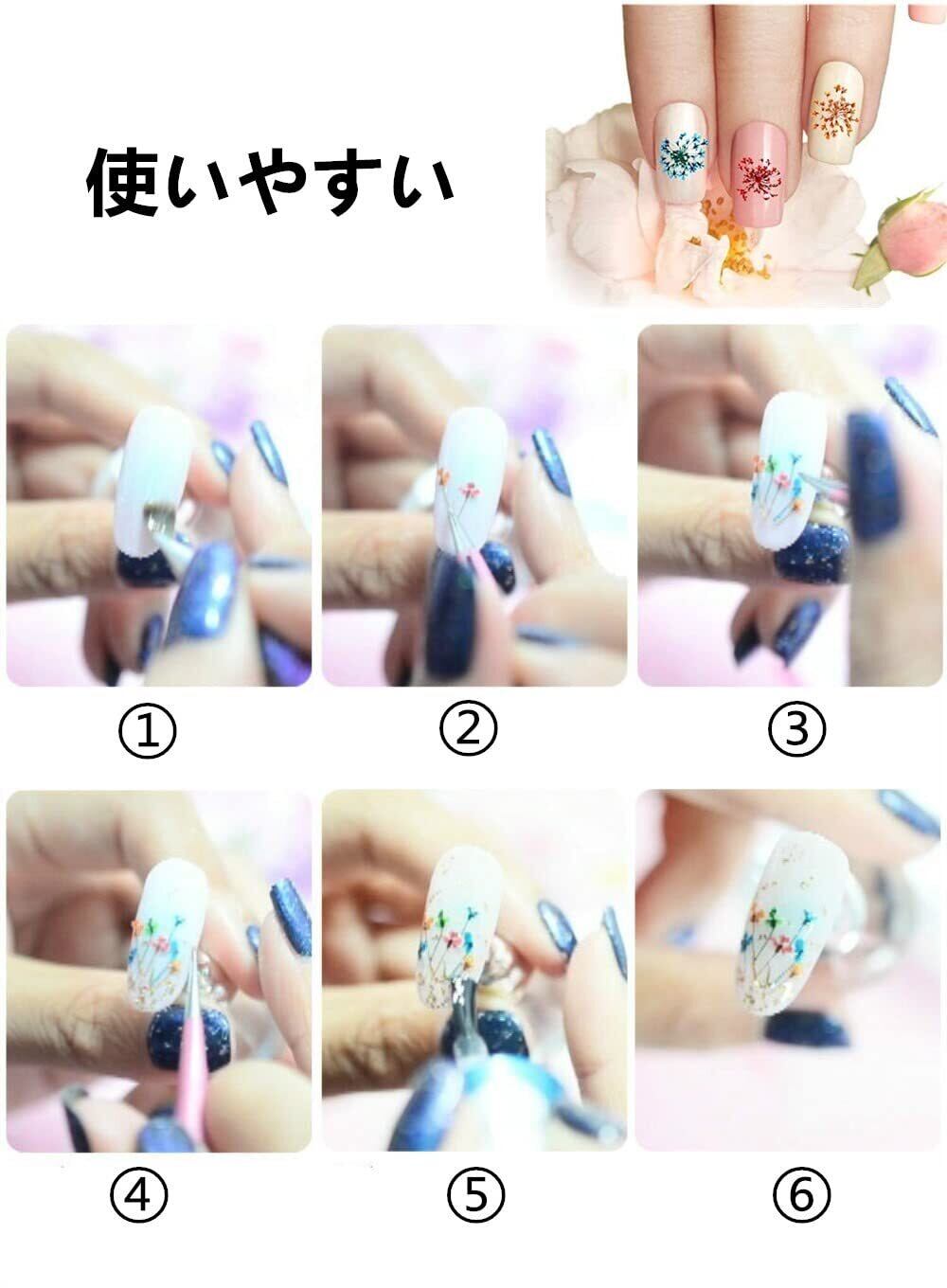 【使いやすい】これらのドライフラワーは、ネイルアート用に設計されており、お色がどれも可愛く、実に合わせやすいセットになっています。天然または人工の爪と一致し、ジェルまたはアクリルカプセル技術で爪に簡単に適用でき、取り外しも簡単で、通常の方法で浸すだけで す。
