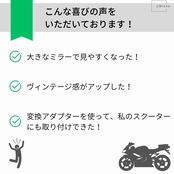 【材質】ミラーを覆うシェル(ミラーカバー)部分:ステンレス、ロッド部分:クロームメッキスチール、ミラー:ガラス鏡、【備考】正ネジ8mm取付変換アダプターを付属