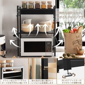 【中棚板高さ調整可】こちらのレンジラックの中棚板が間隔5cmで三段階調整でき、レンジ、トースター、炊飯器などの電器のサイズに応じて高さ調整できます。またレンジ台は三段式で調味料・調理器具などを分類してきれいに収納できます、スペースも節約します。