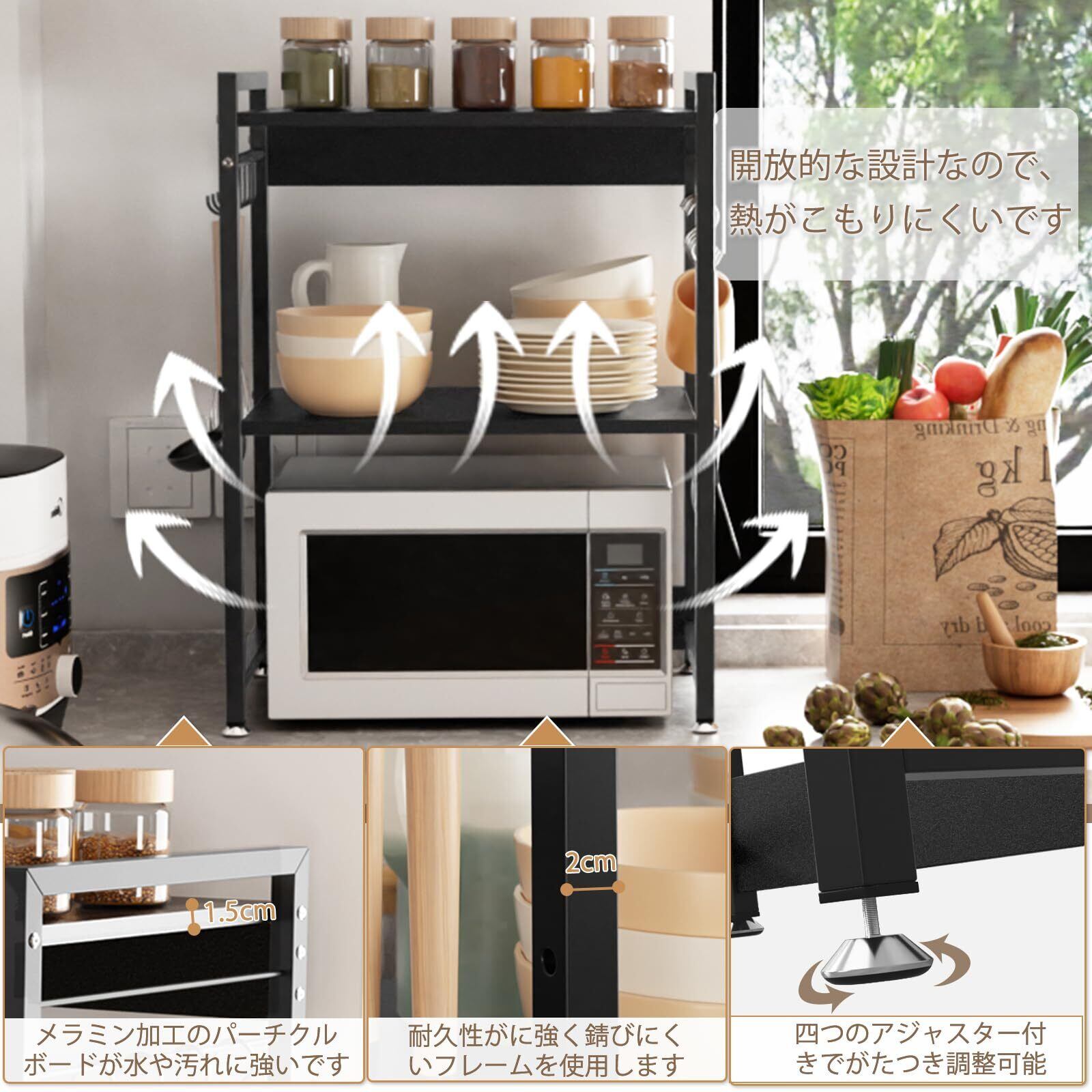 DEWEL レンジラック レンジ台 レンジ上ラック キッチンラック 中棚板高さ調節可 フック付き 幅53cm 食器棚 トースターラック ラック アジャスター付き キッチン収納 省スペース ブラック