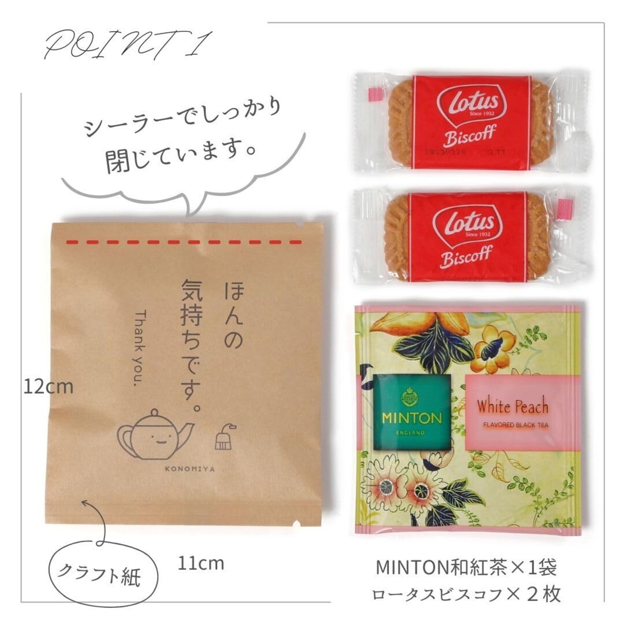 1袋に、MINTON和紅茶1袋、ロータスカラメルビスケット2枚が入った10袋セットです。