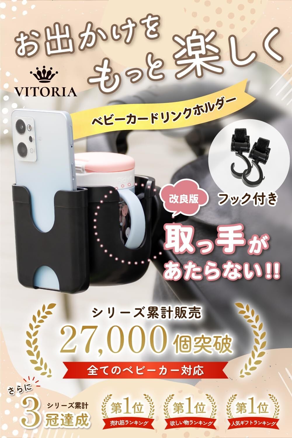 【人気商品】VITORIA (ヴィトリア) ベビーカー ドリンクホルダー 自転車 カップホルダー ベビーシート 【360度回転 ABS樹脂素材使用】 (スタンダード) (スマホケース付き)