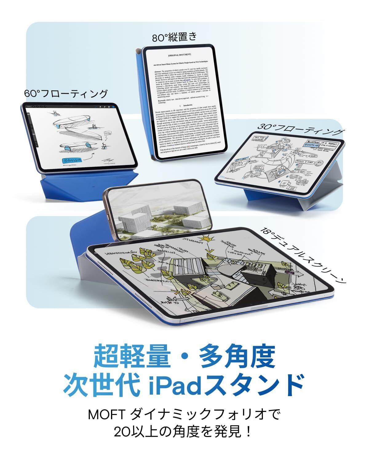 【究極の人間工学・フローティングモード】MOFTダイナミックフォリオの最大の特徴は「フローティングモード」です。人間工学に基づいてiPadを5cm以上持ち上げられ、目線の高さで作業でき、首への負担を大幅に軽減し、長時間の使用でも疲れません。イラスト作成に最適な「30°フローティング」から、動画鑑賞にぴったりの「60°フローティング」までスムーズに変形でき、あなたのインプット・アウトプットの作業姿勢を常に適切に保ちます。