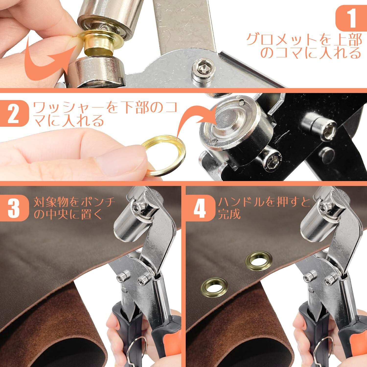 【製品仕様】材質:炭素鋼(メッキ処理済);穴径:10mm;パケージ内容:ハトメパンチ*1本;シルバーハトメ*500枚;金ハトメ*100枚;黒いハトメ*100枚;合計700枚入り。