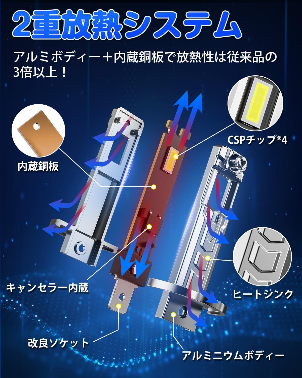 『業界初2重放熱&IP68防水』ほかのH1 ledを取付ばっかりで、不点灯になりました、その現象はファンが不良の問題でLEDチップが高温を耐えません、ランプが不点灯になりました。本社のH1 LED ヘッドライトは ファンレスデのザインで、騒音やファンの影響で不点灯など問題を全て解決して、2重放熱実現!LED基板の下が最高熱伝導効率の銅板を内蔵されています、航空用アルミニウムボディーに熱を伝導して、本体にこだわりの透かし彫りデザイン,放熱面を増やして、放熱性能がさらにアップ!空気への放熱効率は従来品よりもっと速くてしています。さらに、IP68の防水防塵レベルで、極端な環境でも、安定発光できます。お客様の安全運転をお守りします。