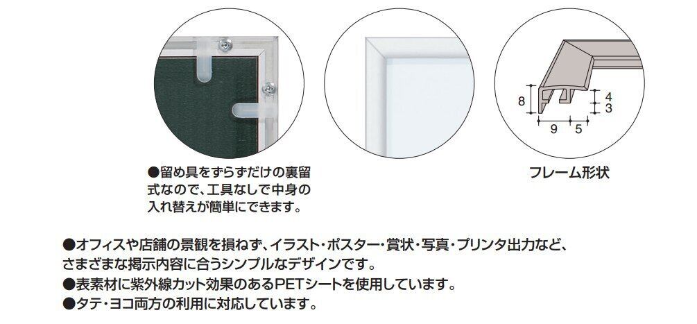 ●留め具をずらすだけの裏留式なので、工具なしで中身の入れ替えが簡単にできます。入れ替え頻度が高い掲示に適しています。 ●表装材は紫外線カット効果のある再生PETシートを使用しています。 ●イラスト、ポスター、賞状、写真、プリンタ出力、各種許認可証の掲示に。 ●種類/B2 ●セット用紙寸法/728×515 ●フレーム外寸法/748×535mm ●フレーム内寸法/719×506mm ●質量(g)/720 ●シートの厚み/0.4mm ●材質/表装材:R-PET、フレーム:アルミ、裏板:グリーンダンボール(古紙パルプ配合) ●フレーム幅/14mm ●厚さ/8mm ●付属品/吊り下げ用ひも1本 ●フレーム色/シルバー