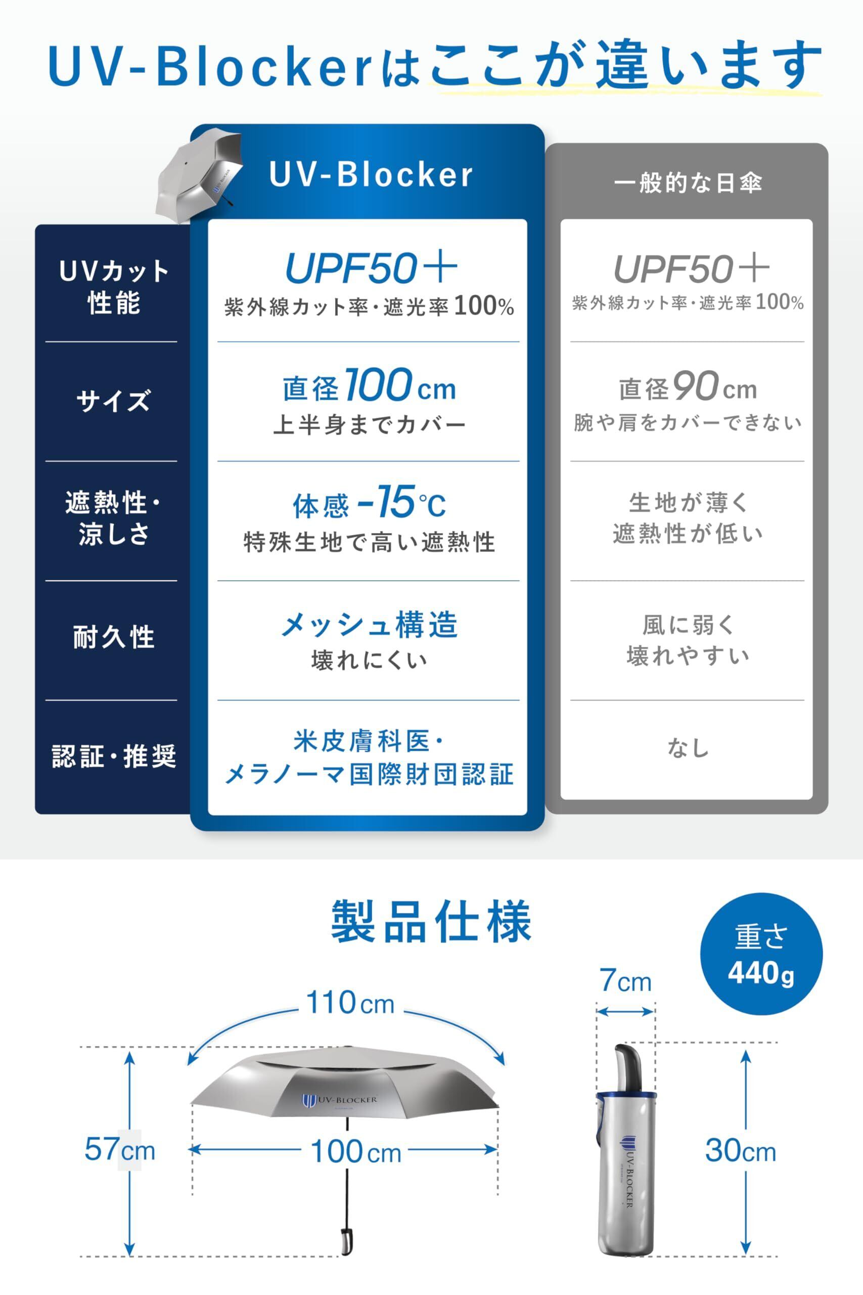 【 世界累計販売数16万個以上突破! 】 ️UV-Blockerは2005年に誕生した米国のビーチパラソル・日傘専門メーカーです。創業者自身が皮膚がんを患った経験から、”紫外線防止性能”に特化した日傘を開発。 米国の皮膚科医や皮膚がん国際団体からも認証されている商品で高い紫外線防止性能を誇ります。アメリカをはじめとした紫外線や暑さの強烈な地域で支持されており、全世界累計販売数16万個を突破した人気の商品です!
