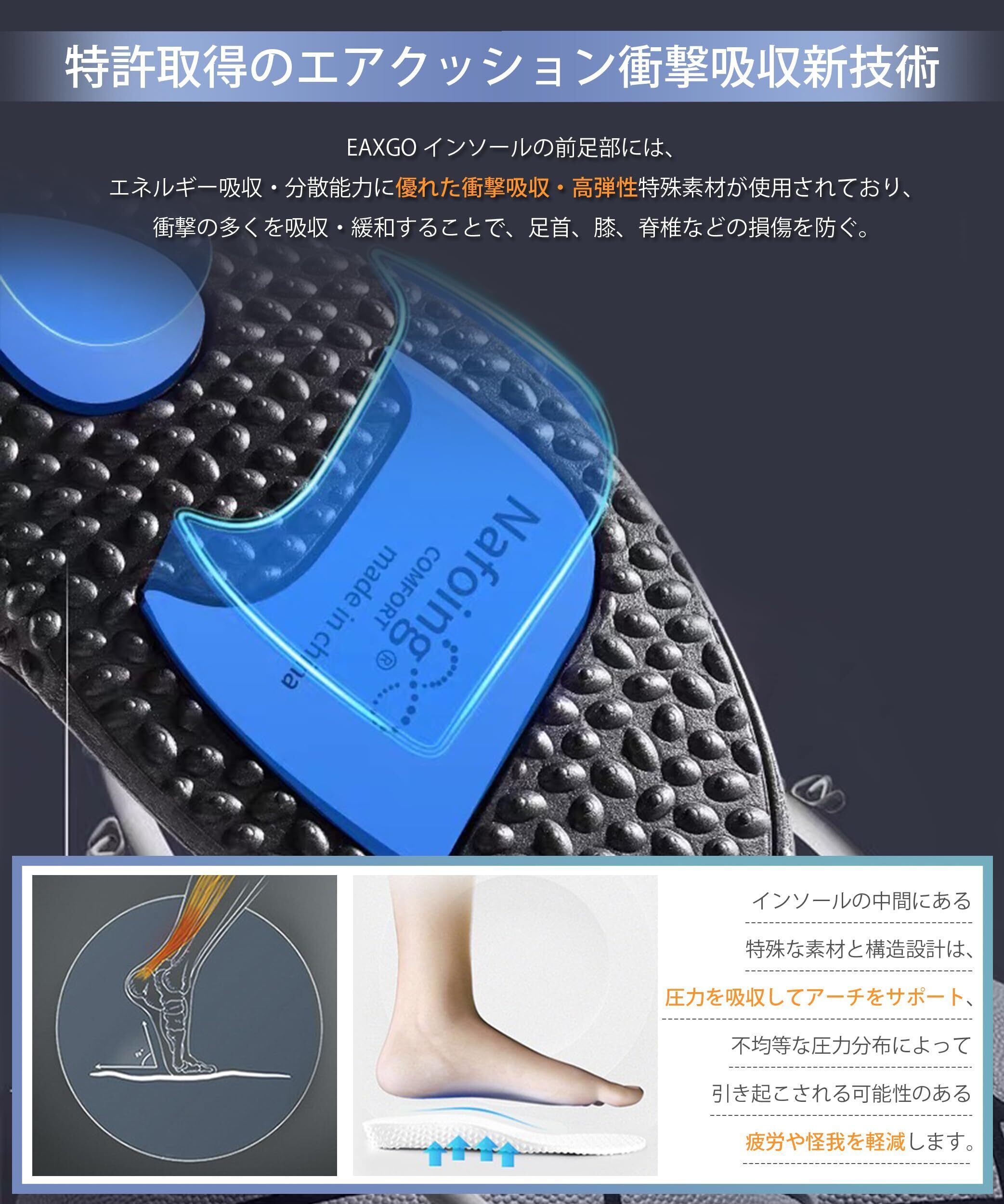 【特許取得のトリプル・エアクッション衝撃吸収新技術】 ①インソールの前足部には、エネルギー吸収・分散能力に優れた衝撃吸収・高弾性特殊素材が使用されており、衝撃の多くを吸収・緩和することで、足首、膝、脊椎などの損傷を防ぐ。②インソールの中間にある特殊な素材と構造設計は、足のアーチを正確に支え、保護することができるため、運動中も足のアーチが安定し、不均等な圧力分布によって引き起こされる可能性のある疲労や怪我を軽減します。③特に特筆すべきは、EAXGO インソールのかかと部分に、特許を取得した先進の新技術、衝撃吸収エアクッションが採用されていることです。衝撃を瞬時に吸収し、かかとへの負担を軽減し、一歩一歩をより安定した快適なものにします。✨さらに、バウンシングを補助し、アスリートにより強力なパワーサポートを提供するとともに、足の健康を守り、スポーツ傷害のリスクを軽減します。