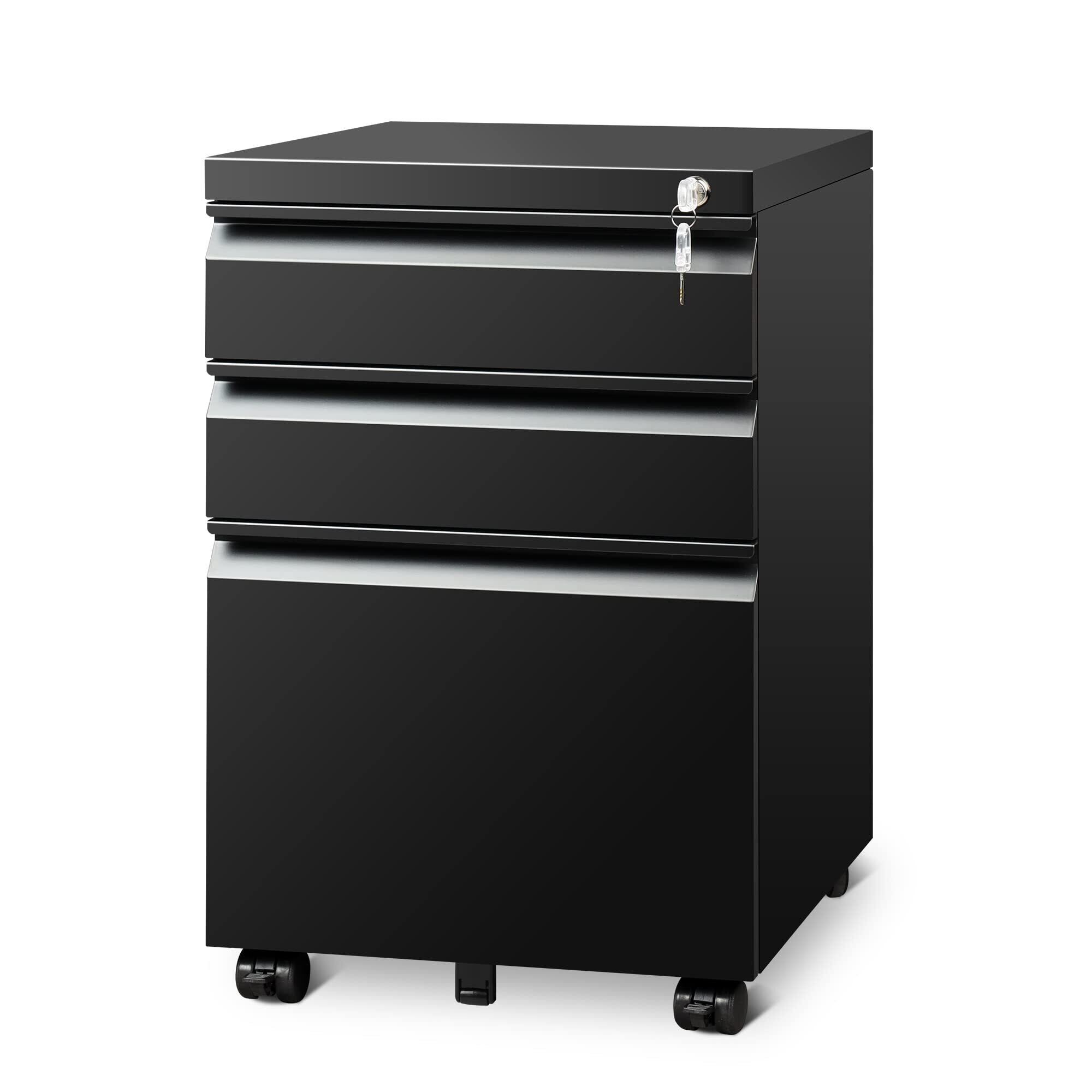 DEVAISE デスクワゴン サイドワゴン キャビネット オフィスワゴン 袖机 キャスター付き 鍵付き 3段オールロック 大容量 A4対応 幅390*奥行480*高さ600mm 丈夫なスチール製 サビ止め塗装 ブラック