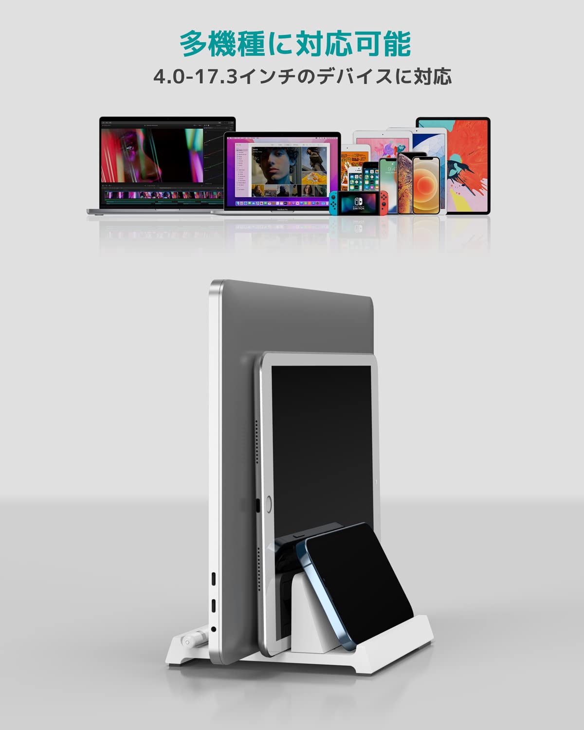 【楽に卓上を整理整頓】デバイスを立てて一箇所に集中して収納すると、様々なものが散らかっている状態から解放され、より多くの卓上スペースを節約し、キーボードや本などを置くためのスペースが作れるようになります。
