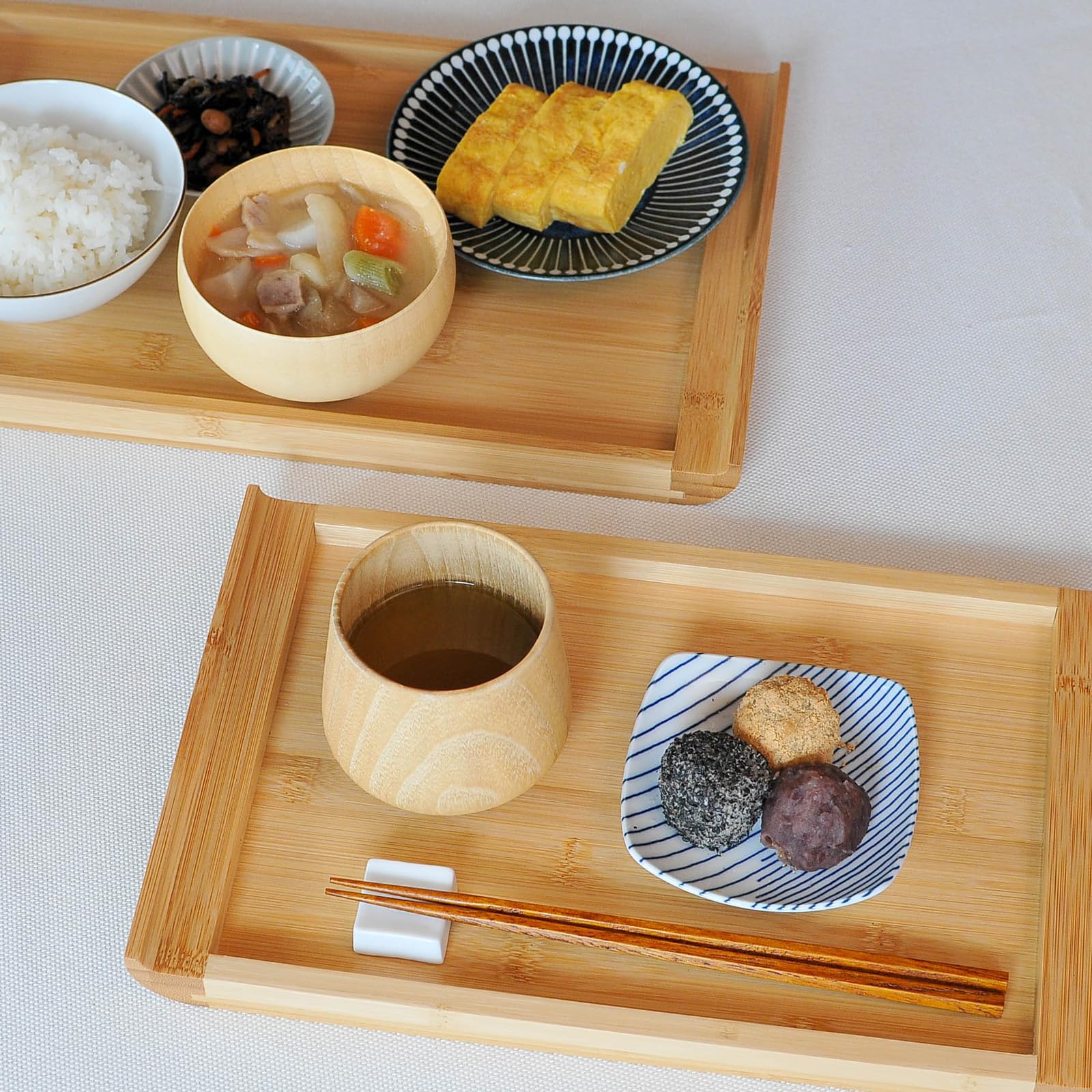?お買い得なトレイ2点セット:大きい方のトレイは食事の配膳などに、小さい方のトレイは一人分のカフェタイムに最適です。