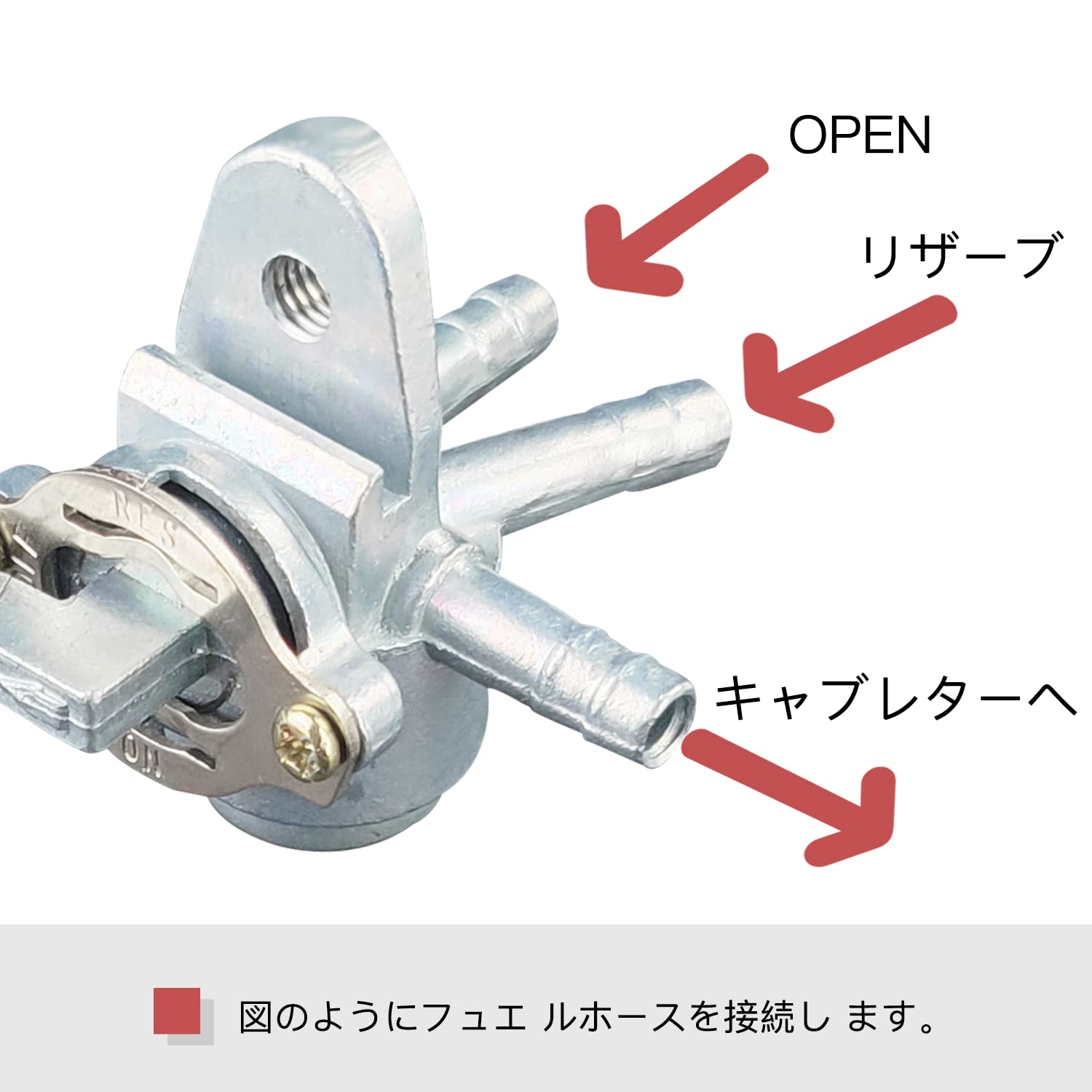 燃料タンクとキャブレター間のフェールコックとなります。ON/OFF/RESの3WAYタイプの燃料コック。純正と同じ、3WAY燃料コックの操作レバーの位置は、下がON、横がOFF、上がRESTORE(RES)。ホース内径φ6に対応。リザーブタンク付きのバイク用。