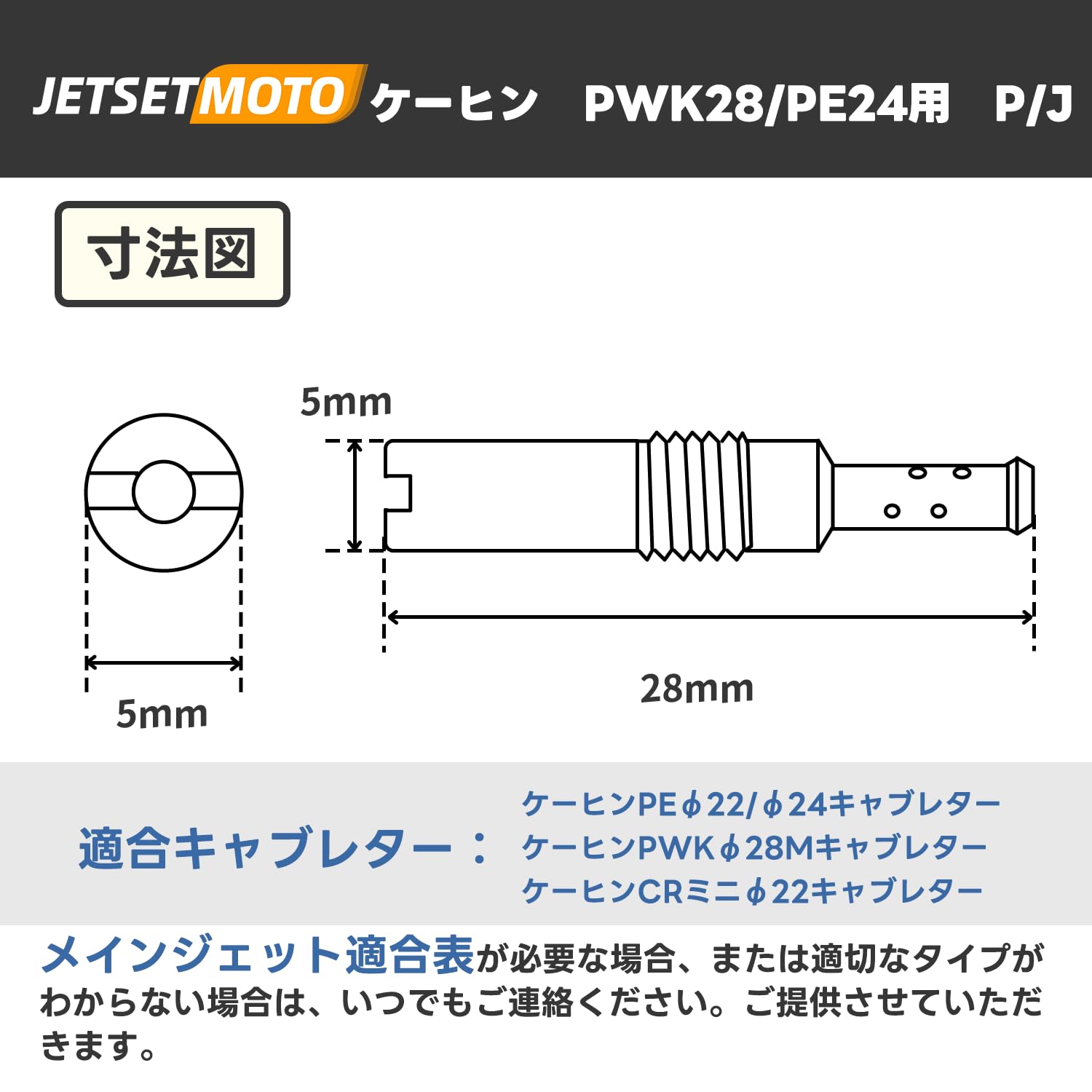 【パイロットジェット サイズ】(ケーヒンPWK28/PE24用) 直径5mm×高さ28mm。
