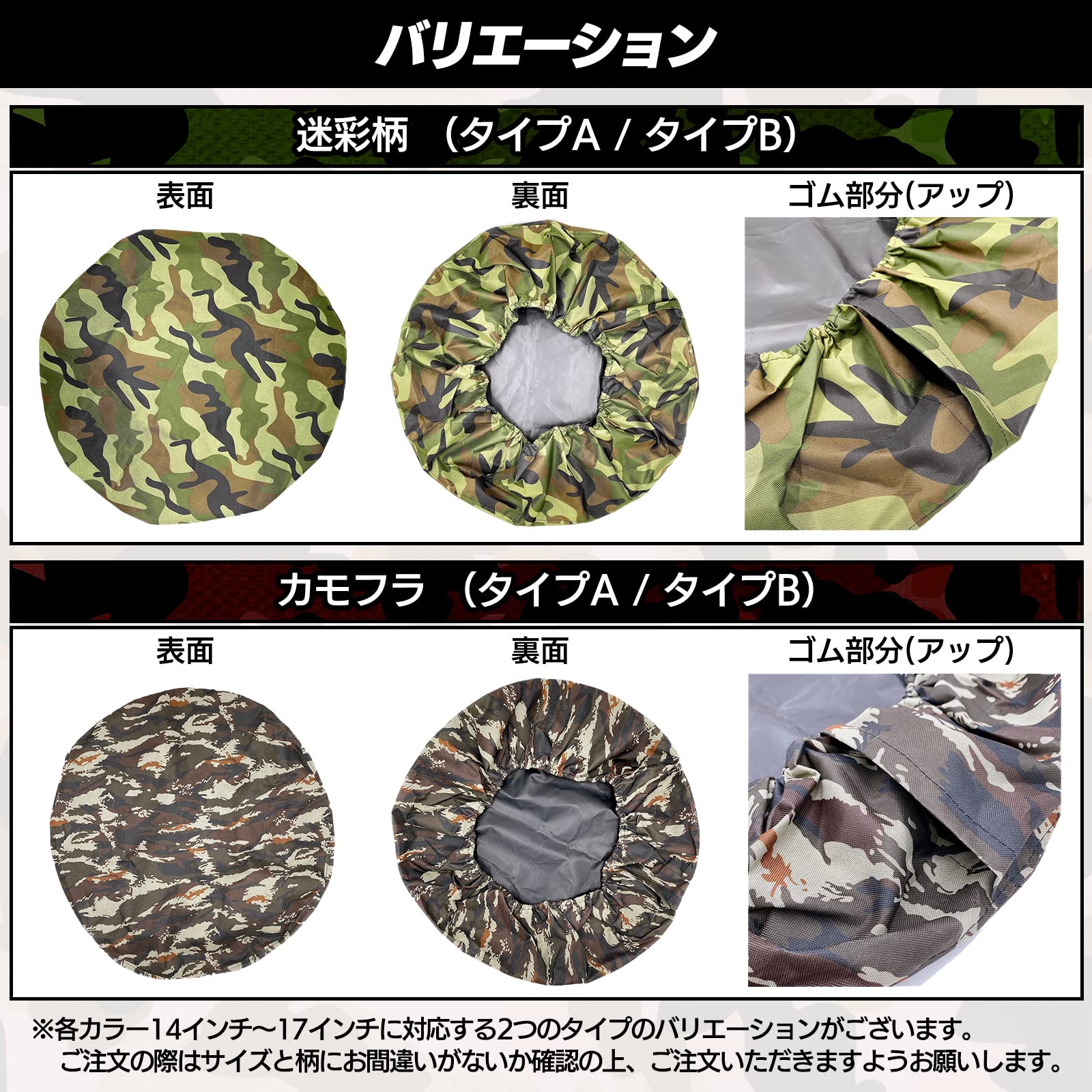 タイプAとタイプBの2種類があり、それぞれ迷彩柄とカモフラ柄のご用意があります。 ※14インチ、15インチ、16インチ、17インチに対応していますがタイプごとに適用が違うので必ず商品画像に記載のサイズをご確認ください。 例えば、エスクードでもタイヤサイズによってタイプAの場合と、タイプBの場合があります。