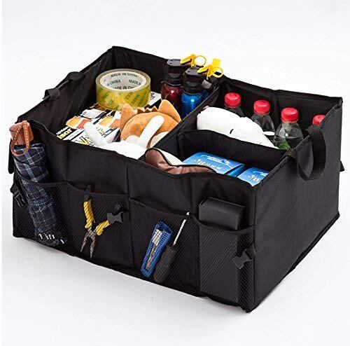 車の中の小物整理などに便利な収納ケースです。 オックスフォード防水生地を使っているので、耐久性もあって汚れにくい仕様です。 車の中でバラバラになりがちなお子様の遊び道具、スポーツ用品、釣りの道具や洗車グッズなども 仕切りがあるのでスッキリ収納できます。 またメッシュポケットが前面に4つ、サイドにもポケットが2つあるので工具などを入れておいても さっと取り出しやすいですね。 持ち手もあって移動もしやすいですし、使用しない時は折り畳めるのでコンパクトに! 止め金具がついているので広がらない仕様です。 サイズ:56 x 40 x 26cm (折り畳み時38 x 27 x 3 cm)、 素材:オックスフォード