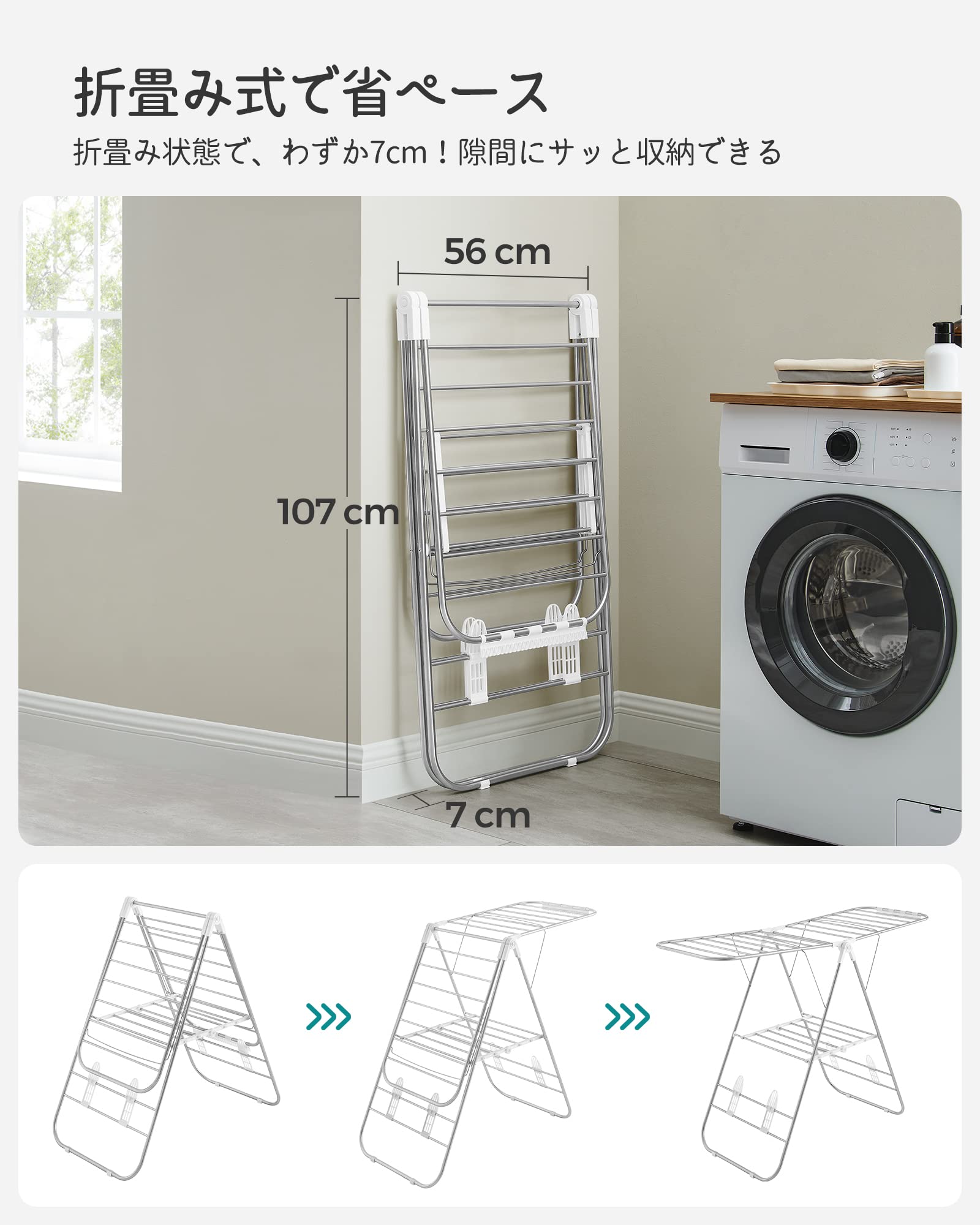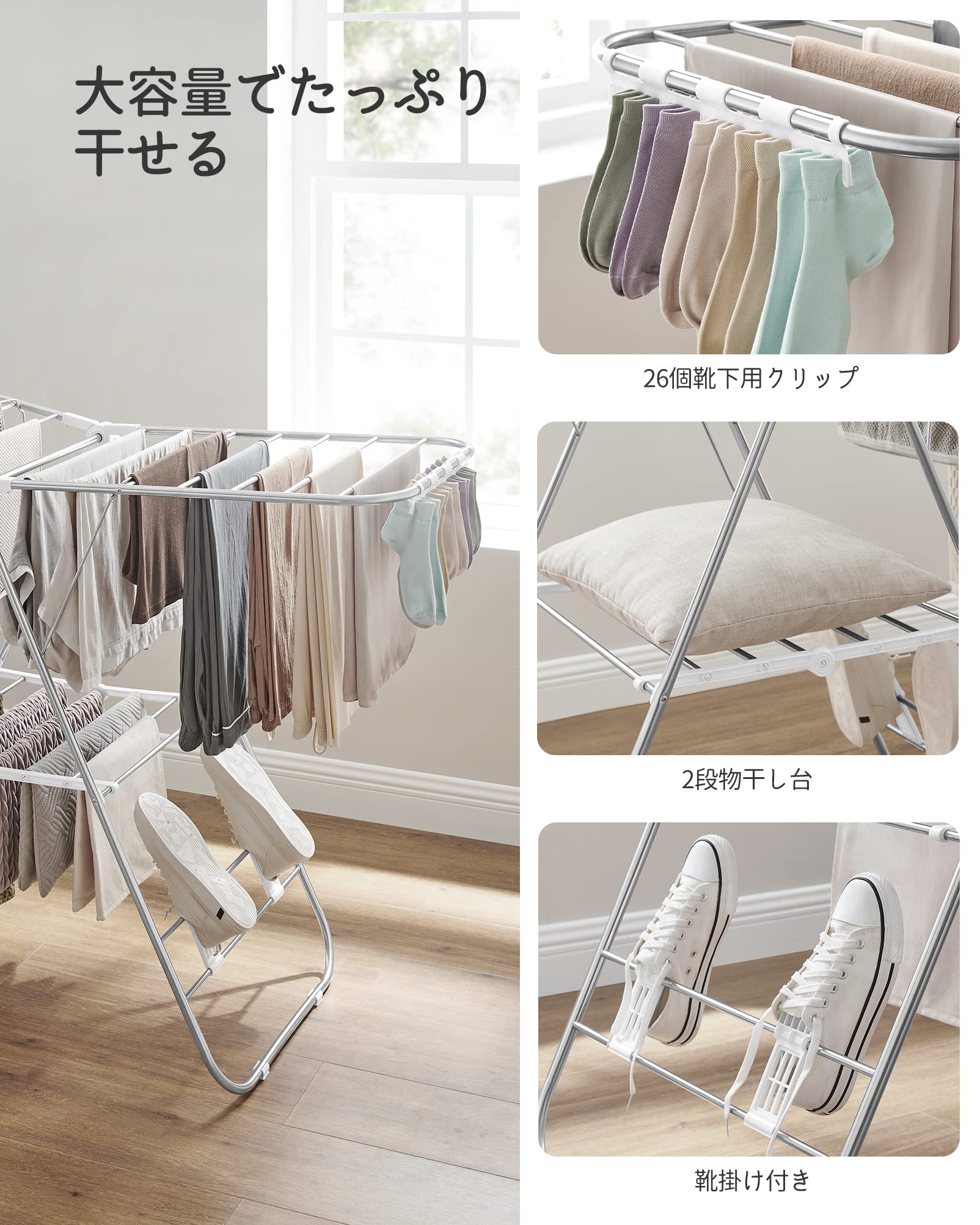 【数量限定】SONGMICS 物干しラック 室内 物干しスタンド 洗濯干し台 布団干し タオル干し 折り畳み式 幅147cm 物干しハンガー 物干し竿 省スペース スチール製 頑丈 ベランダ 屋外 錆びにくい コンパクト 完成品 LLR502W01
