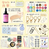 ??【セット内容】レジン液(ハードタイプ)65g、液体着色剤7色(レッド・パープル・ブルー・グリーン・イエロー・ブラック・ホワイト)、調色パレット、調色スティック、シリコンモールド3種、封入素材小瓶48個セット、ミックスキラキラパーツ1ケース、メタルパーツミックス1個、キーホルダー2種、カニカン付きストラップ4本、台座付きヘアピン2個、ピアス&キャッチ4個ずつ、イヤリングパーツ2個、ネックレスチェーン1本、スライスアソートパーツ1袋、ウッドスティック5本セット、ピンセット、ネイルファイル、両側機能付き筆1本、空枠&ミール皿全部で6種、歯車パーツ適量、UVライト、収納ポーチ