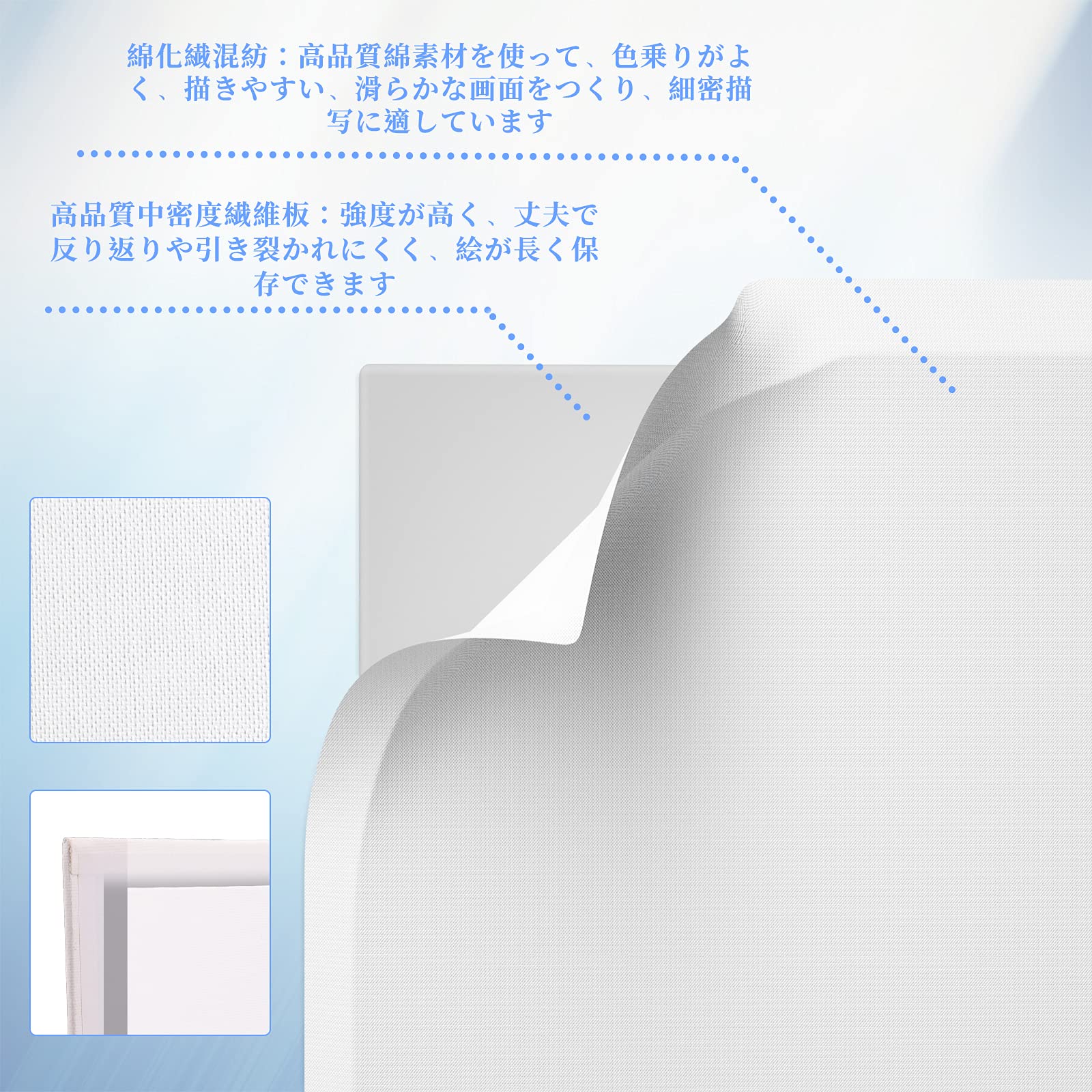 【優れる綿化繊混紡】素材は綿・化繊の高品質素材を素材を採用しております、麻張キャンバスに比べ目が均一できれいです。キャンバスは中目、油彩・アクリル兼用、さまざまな絵具に対する吸収性にすぐれ、引き裂きにくく、塗料が漏れ防止可能。亜麻に比べ繊細な綿は、滑らかな画面をつくり、細密描写に適しています。アクリル絵具・油絵の具を使って本格的な絵の世界を表現出来る!