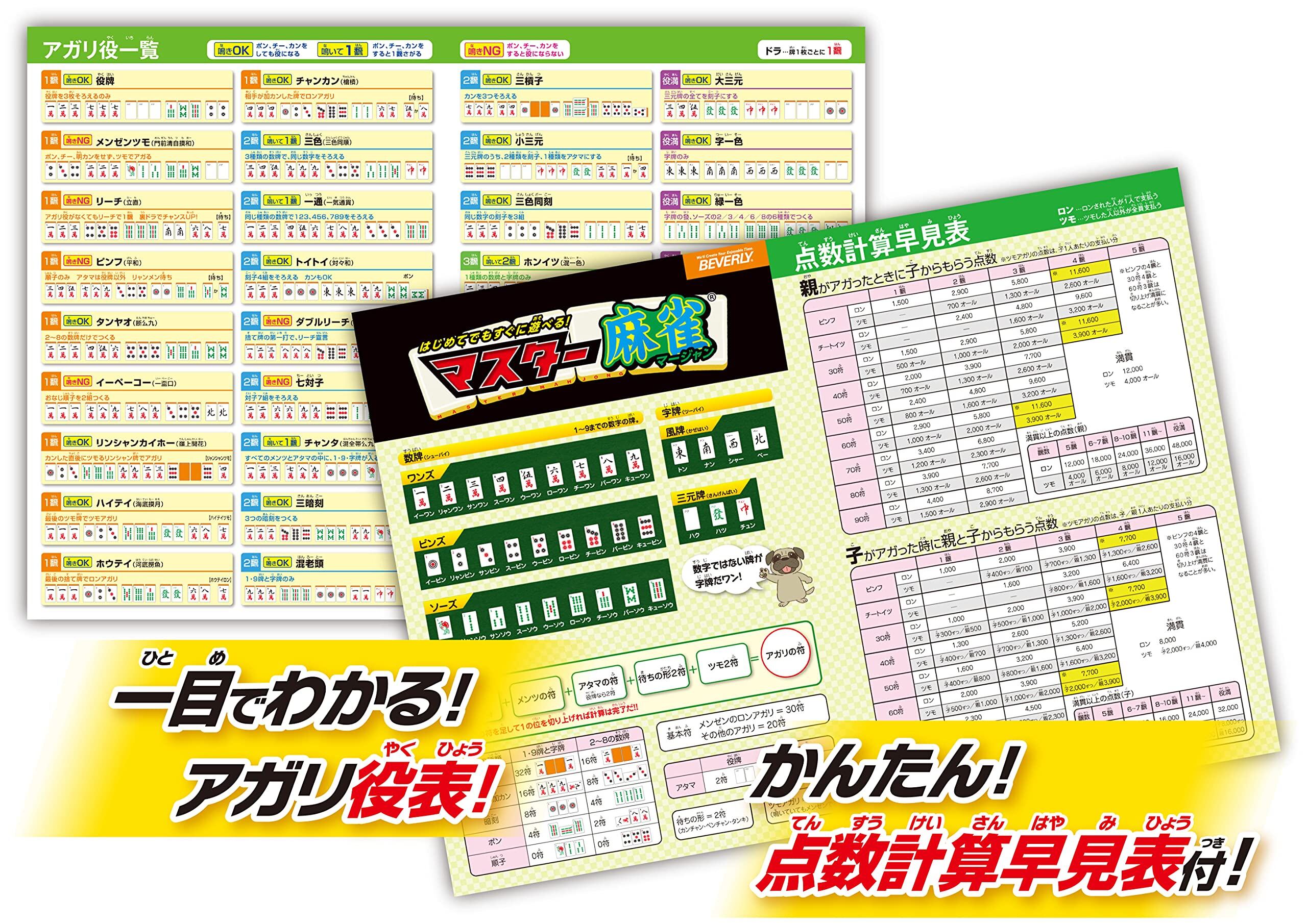 はじめてでもすぐに遊べる、マスター麻雀。数字入り牌、数字入り点棒、ガイド付きマット、上がり役表、点数計算早見表など、初心者にもわかりやすい機能満載で、遊びながらルールが覚えられる。簡単スタートブック付き。