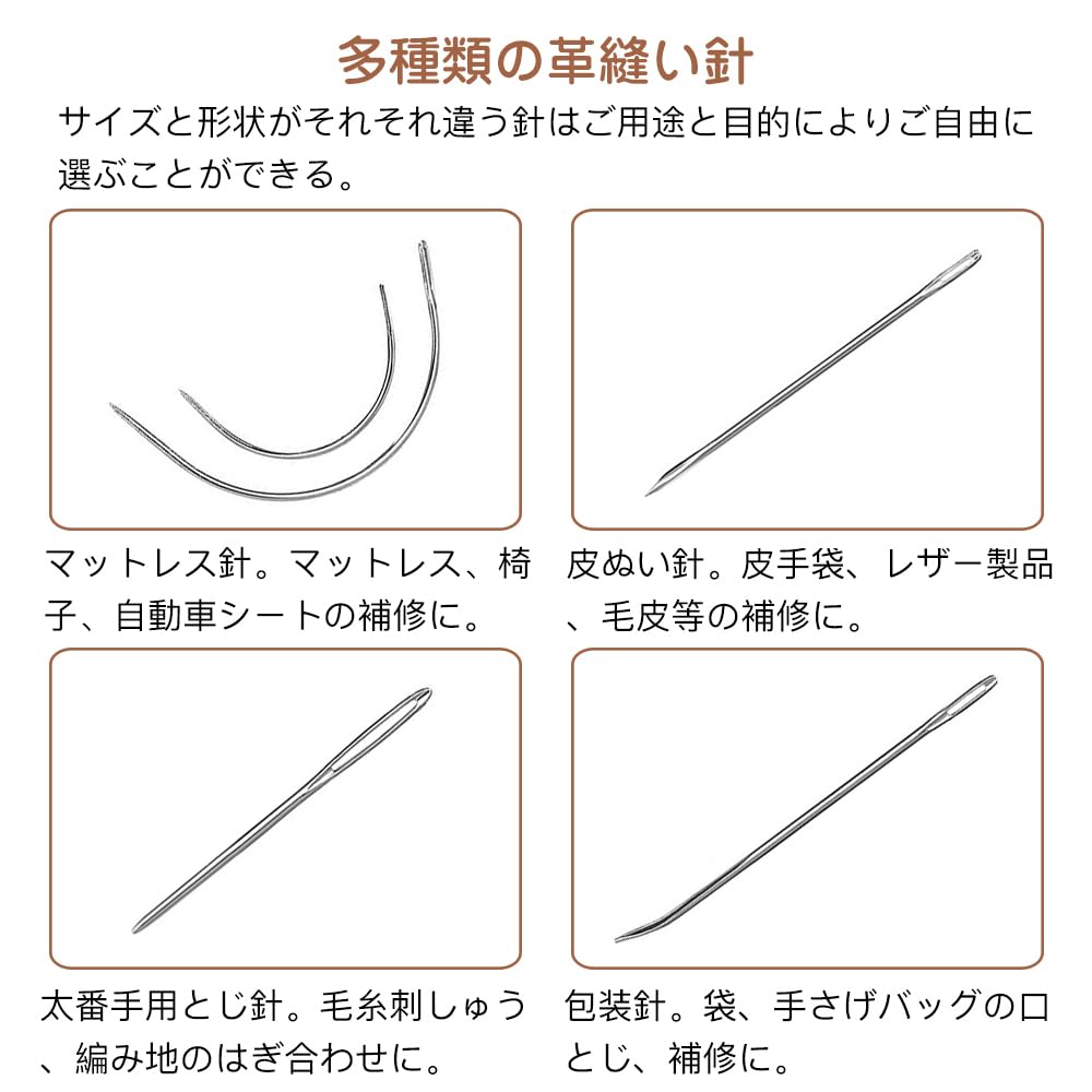 多種類の革縫い針:針先が丈夫で鋭いです。革用の工具セットに様々なサイズと形をしている針先があります。結び目の針と先鋭い針、三角針、カーブ針なども含まれます。