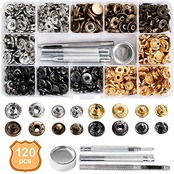 【セット内容】:サイズ:633/12mm用、穴あけポンチ/2.5mm用、ホック/直径1.2cm、打ち台2cm、ケース/17.3×10×2.6cm 材質:工具/鉄、ホック/銅 重量:285g カラー:ゴールド・シルバー・古銅色・ガンメタル。4色のホック各30組と、専用のホック打ち具を一箱に揃えた便利なお得セットです。120組ホック+工具*4 (切れ味の良いハトメ抜き(ポンチ)、凹型打ち棒、凸型ち棒、打ち台)+収納ボックス。