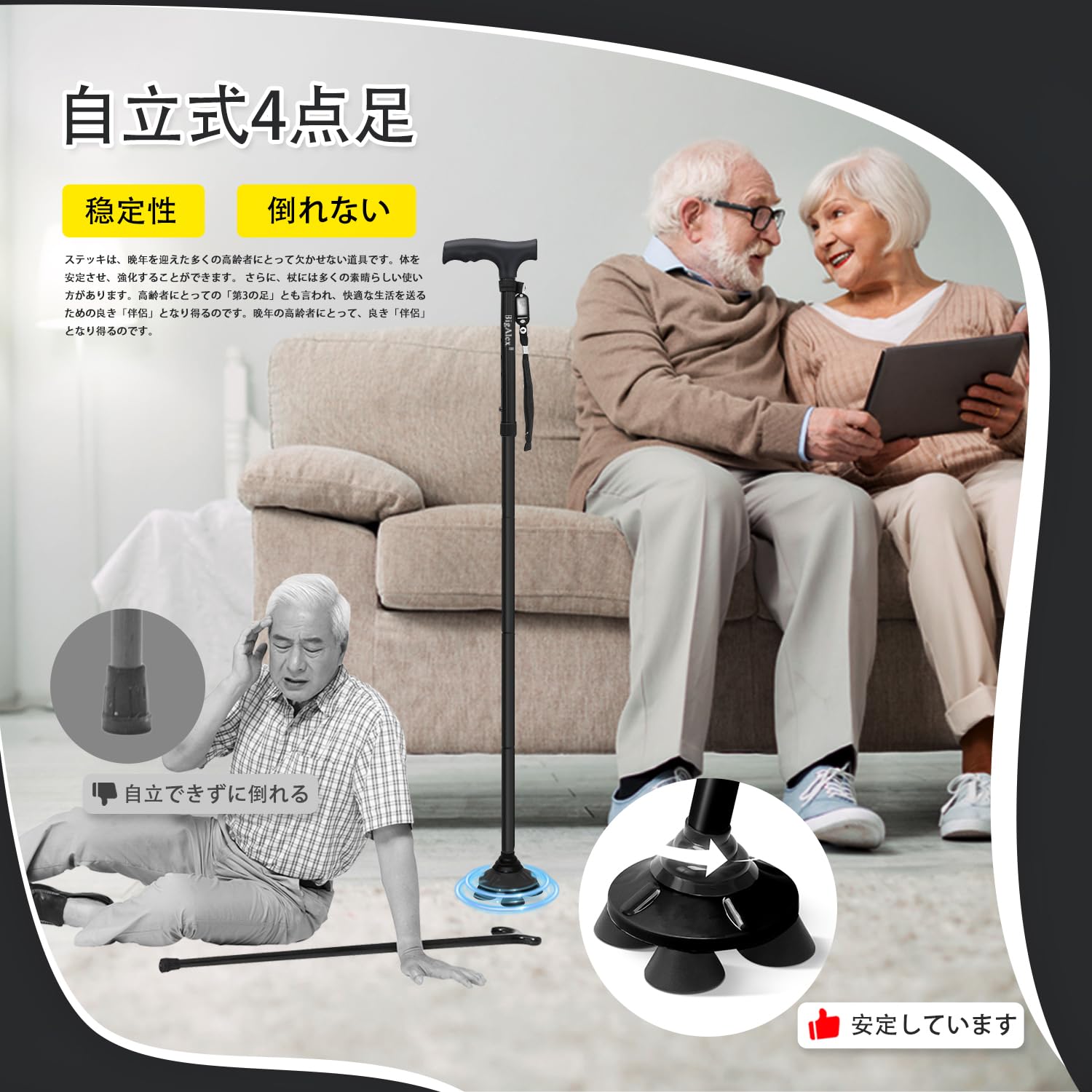 【360°自由回転】BigAlex杖のベースが360度自由に回転できます。ボールヘッド軸とプラスチックベースを使用して、その使用寿命を増やすことができ、部屋や他の場所で使用することができます。凸凹道や階段、坂道などの不安定な場所でも地面を捉え、より快適で安全な歩行が実現できます。