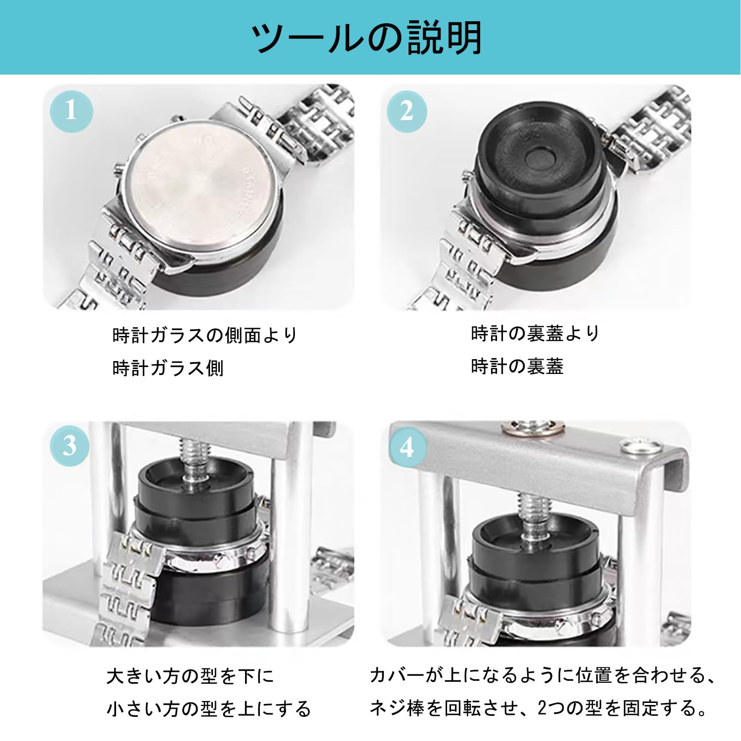 3.【簡単な操作】:腕時計メンテナンスの必需品 裏蓋閉め機でございます。修理や電池交換の際、裏蓋を自分で簡単に開ける、閉じるため工具セットです。使用:1合わせるサイズを選択します。2本体に接続します。 3上と下両方を固定します。 4本体を捻って蓋が締めます。