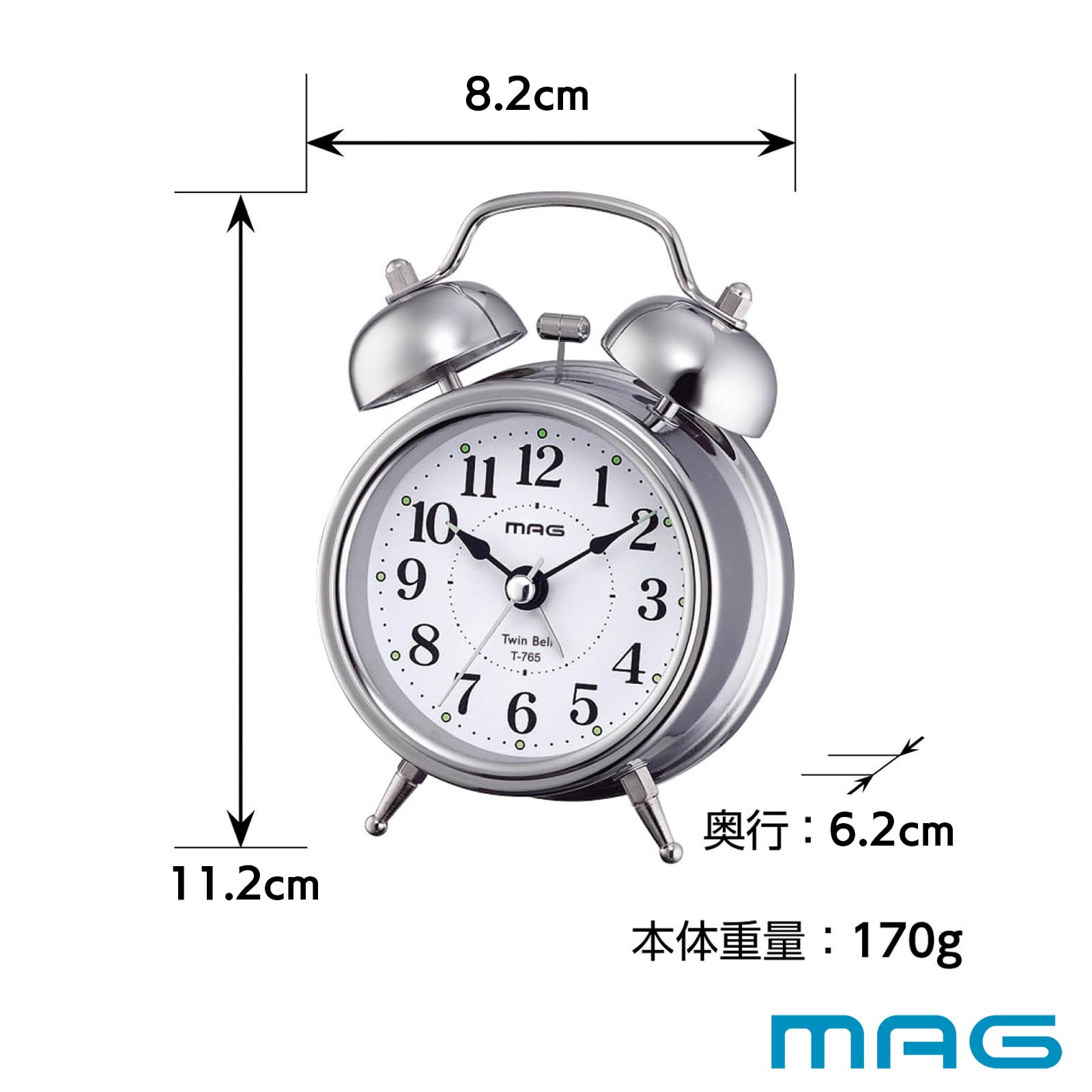 【新着商品】MAG(マグ) 目覚まし時計 置き時計 小型 小さい かわいい ツインベル アナログ 静音 連続秒針 ベル音 アラーム スヌーズ ライト シルバー ベルズミニDX T-765 S-Z ノア精密