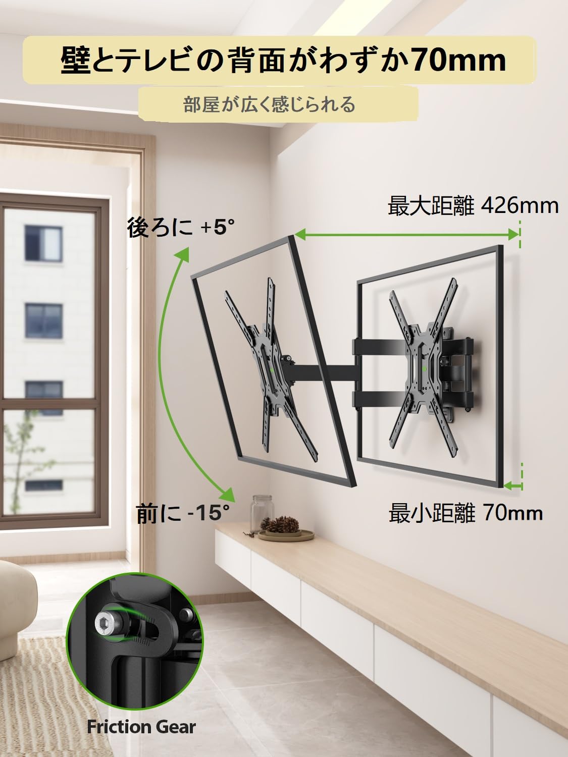 【角度調整可能】アームの左右角度調節は3箇所があります。1. 壁側の取付け部は左右各90度で角度が調整できます(テレビ画面の大きさによる)。2. アームとアームの接合部は壁面から70〜480mmまで調整可能です。3. テレビ取付け金具部は左右各4度、上向き5度、下向き15度で角度が調整できます。るので、引き出して必要な位置に画面を移動できます。