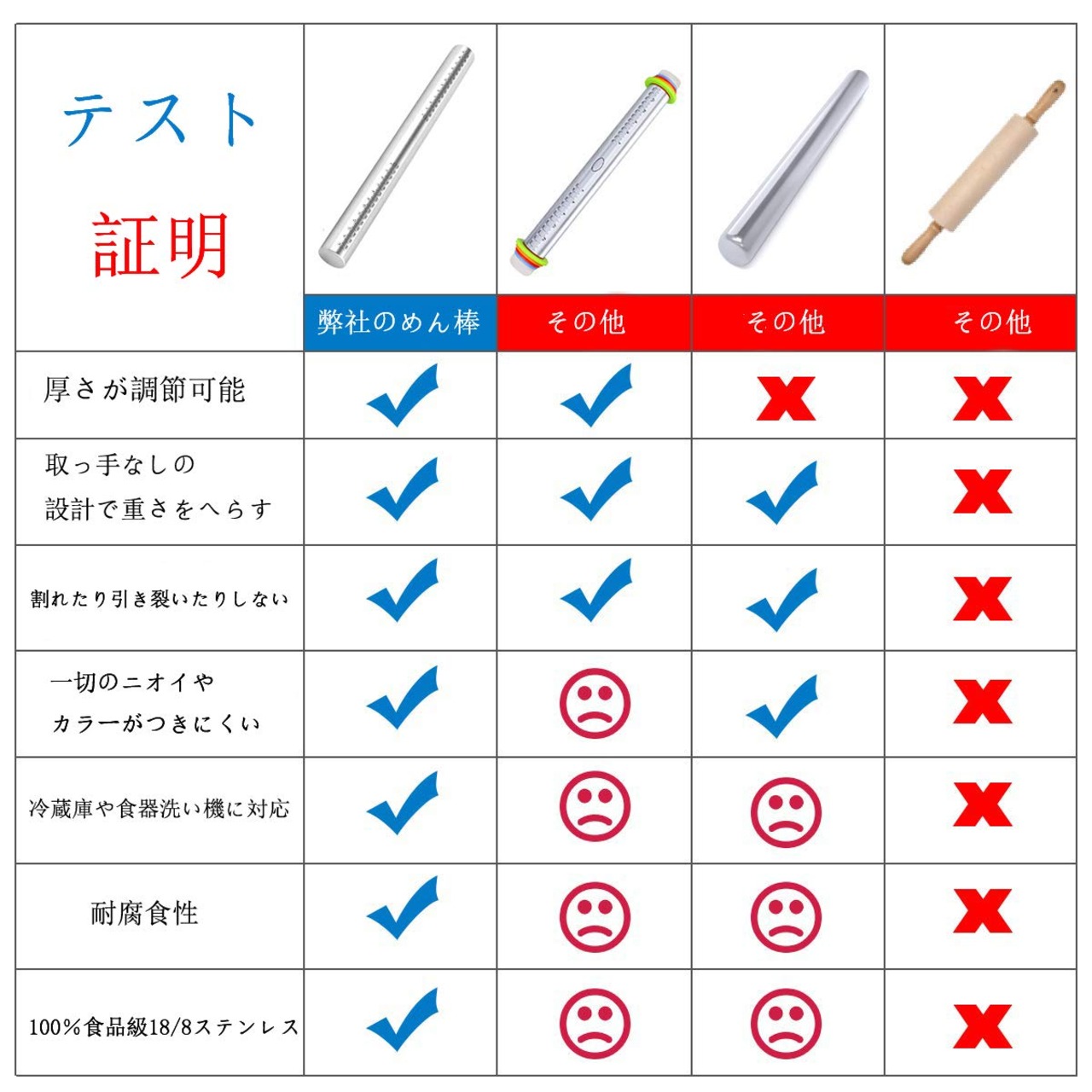 衛生と健康:木製のめん棒とは異なり、孔無しのステンレスは交差汚染を防止し。臭いがなく、色がありません。金属麺棒は食品の品質と健康の基準を満たしており、安全性と衛生状態を確保します。