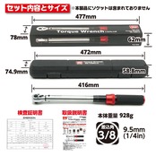 【トルク対応レンジ】20-100N・m 【精度】±3% 【本体サイズ】長さ416x幅39x高さ39mm 【本体重量】928g 【差込角】9.5mm(3/8in) 【材質】本体/40CR鋼材 ロックリング/アルミ グリップ&エンド/アルミ