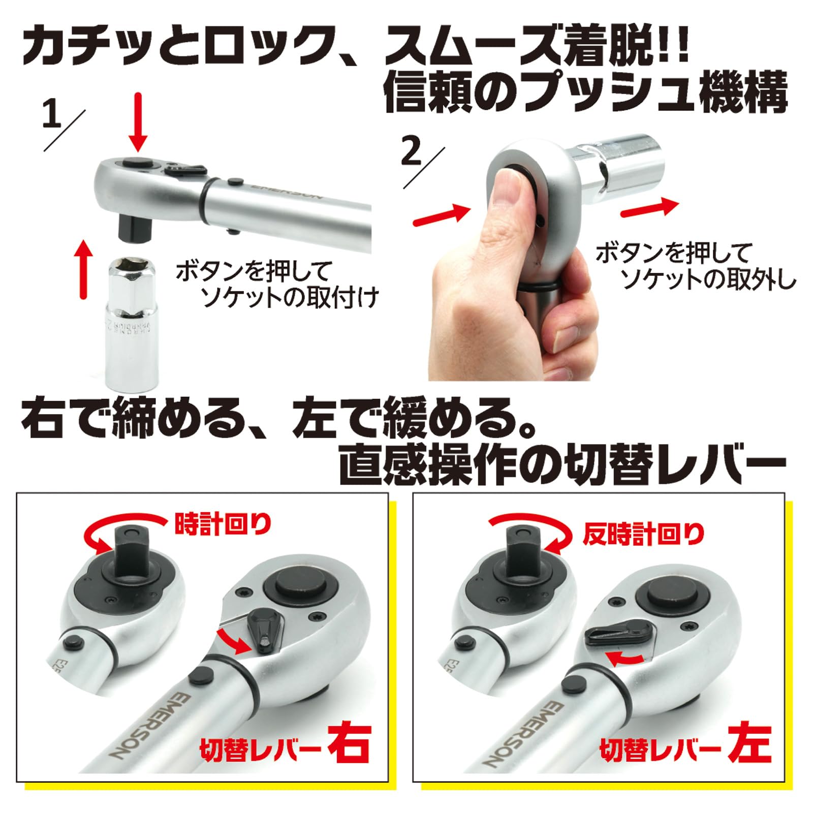 【数量限定】エマーソン(Emerson) トルク調整が簡単らくらくなトルクレンチ ロックリング式 差込角 9.5mm(3/8インチ) 20-100N.m 高精度±3% 72枚ギア 検査証明書付き 自動車 バイク 自転車 整備 修理工具 作業工具 EM-395