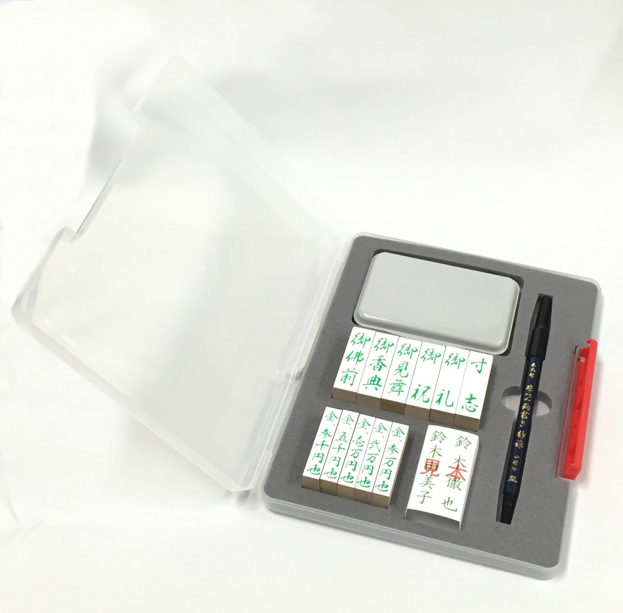 慶弔ゴム印:5×1.5×2.3cm 金額ゴム印:5×1×2.3cm スタンプ台(黒のみ):10.2×7.2×1.5cm 筆ペン:直径約0.9cm×1.88cm お名前ゴム:(1ヶ分)5.8×1.5×2.3