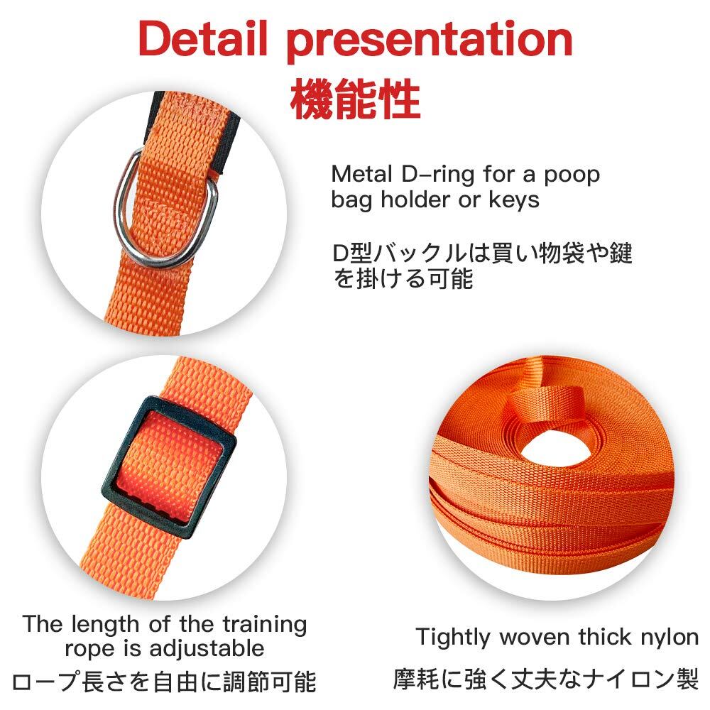 【ロープ長さを自由に調節可能・広い使い方】 ハンドルは高密度な防水スポンジを採用し、優れた柔軟性と汗の発散効果ので、長い距離を歩いたり走ったりしても、手は刺激されません。ハンドルをウエストに巻いたり、たすき掛けにしてジョギングなど使い方は自由自在です。別に、ロープの長さを調節できます、木や柱等に簡単にも係留し、ペットを自由に遊ばせます。