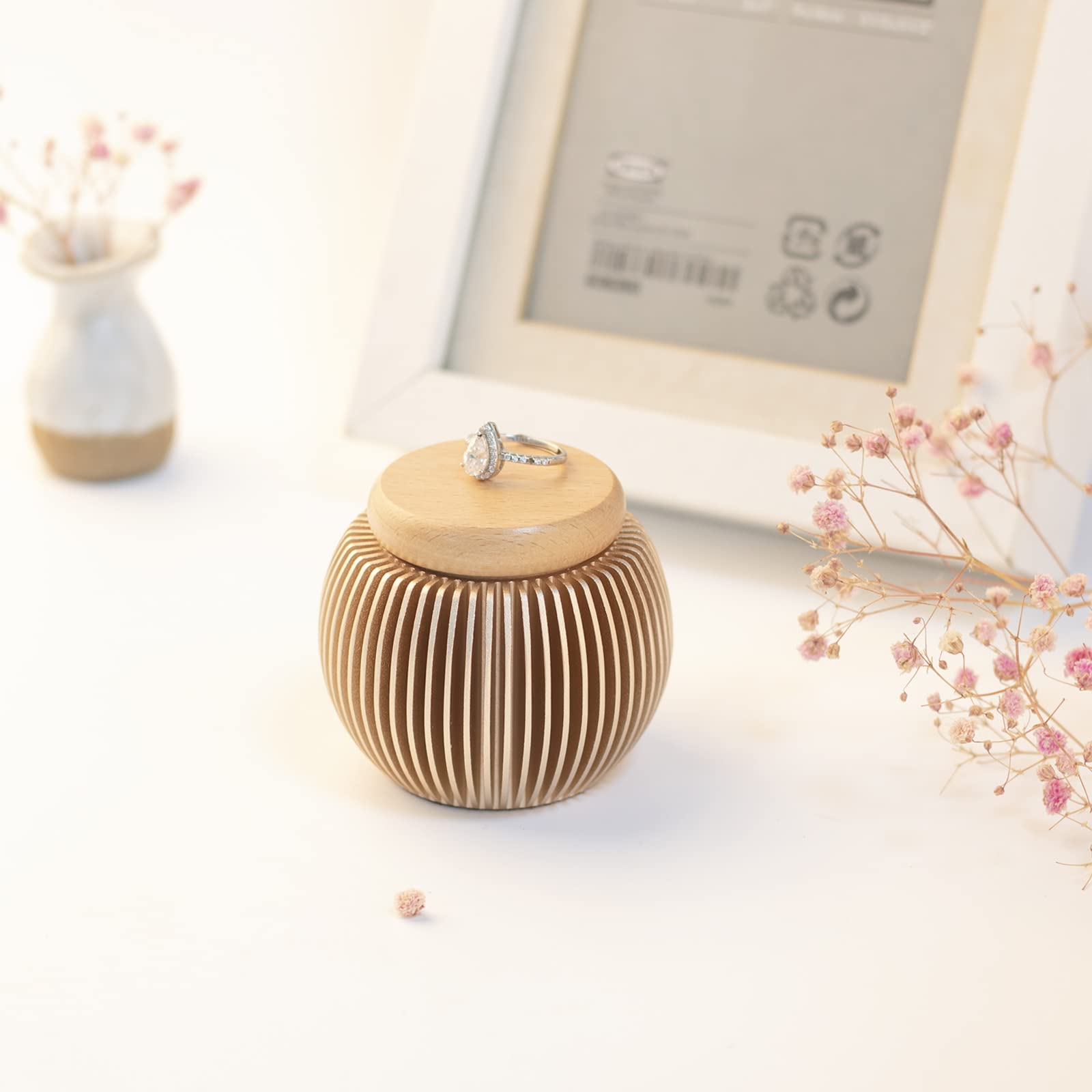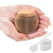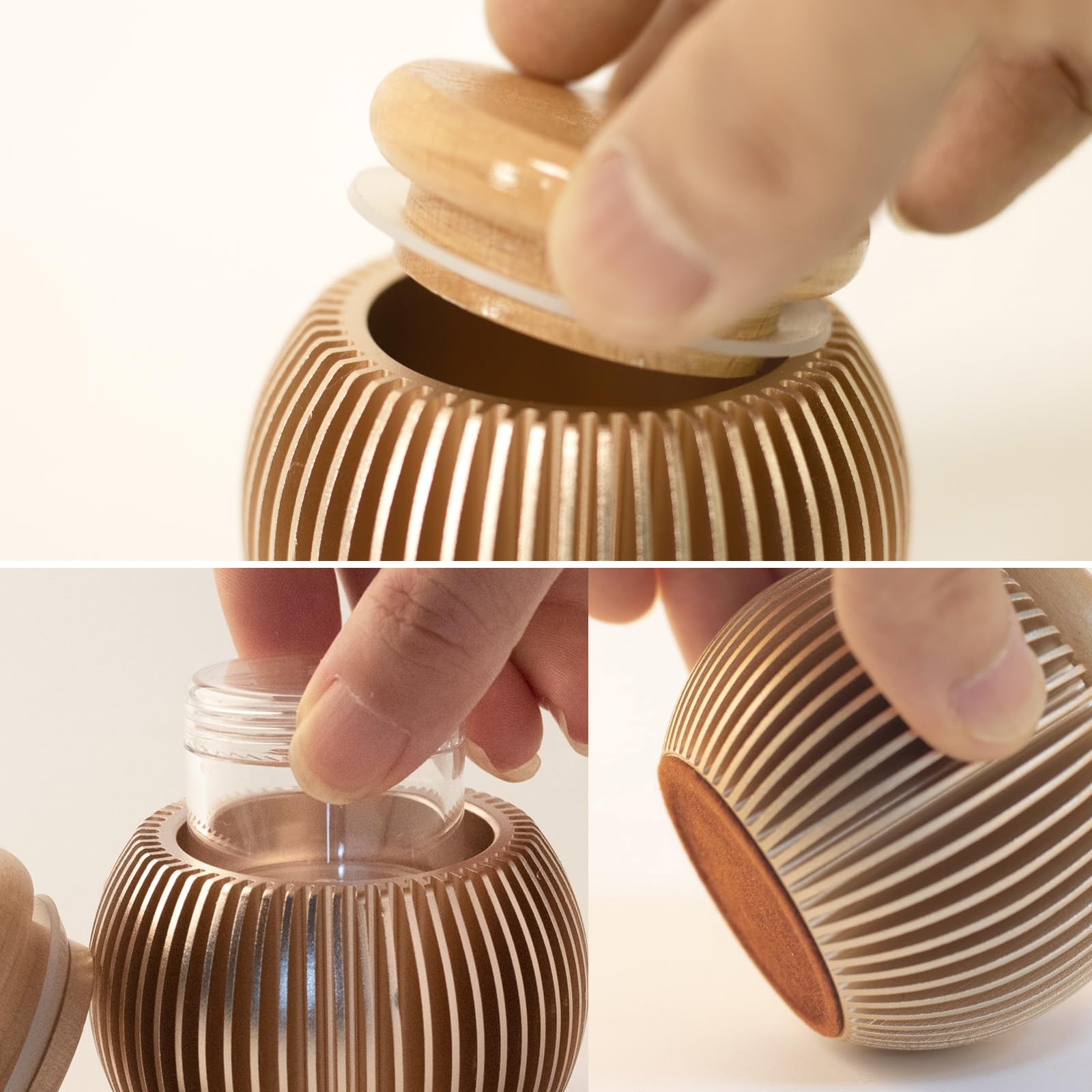 【両手で包み込める程よいサイズ】 骨つぼサイズ:外寸法:直径6.6cm×高さ5.7cm/内部収納有効寸法:直径約4.1cm×高さ約3.5cm/材質:アルミ製+天然木ブナ材無垢+透明アクリルボトル。抱きかかえた時にしっくりする、丸いデザインにこだわりました。大切な人とペットちゃんの遺骨や毛髪を納めて、身近にいつでも手を合わせることが出来るところに置いて手元供養します。