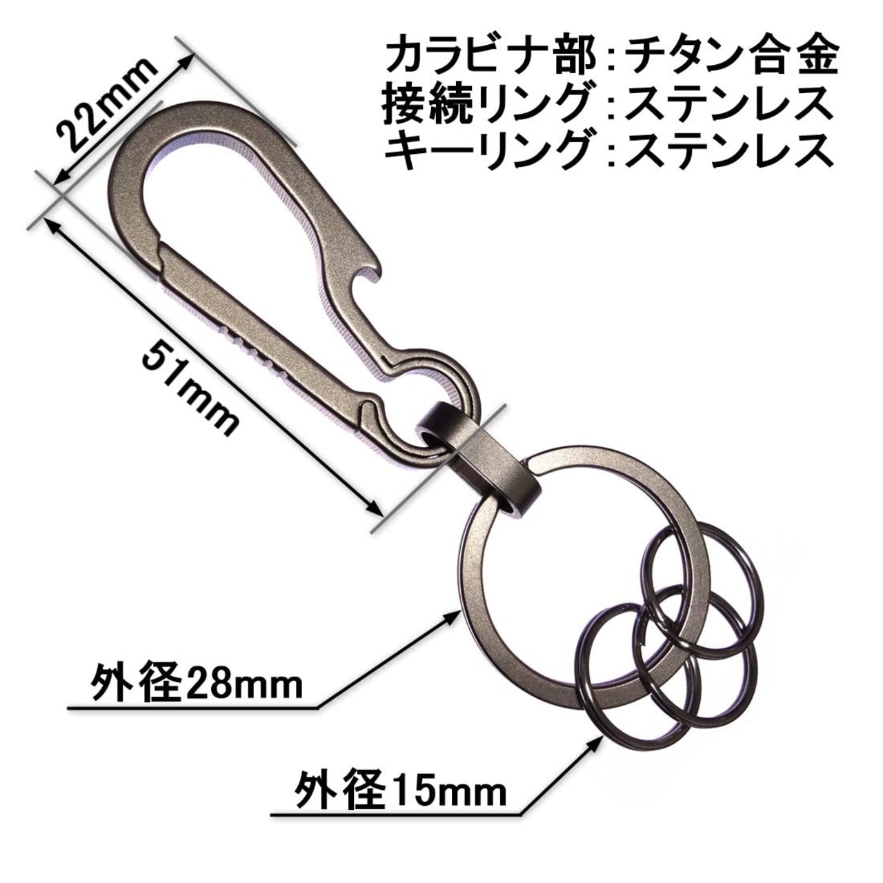 表面をマットな質感に仕上げており、チタン合金そのものの色合いと相まってシックで渋い雰囲気のカラビナ キーホルダーとなっております。 【寸法】カラビナ部:約51×22×4mm キーリング外径:約28mm, 15mm 【重量】約13g 【材質】カラビナ部:チタン合金 キーリングおよび接続リング:ステンレス