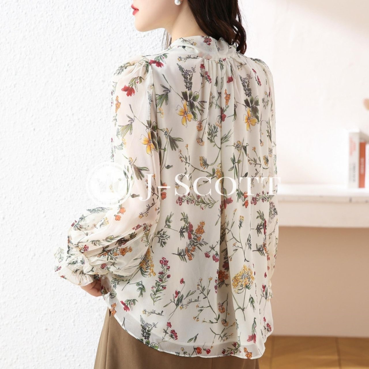 [J-Scott] [ジェイスコット] 花柄ボウタイブラウス シフォン素材 ふんわり袖 袖口ギャザー 裏地有り 長袖 フェミニン レディース JS76