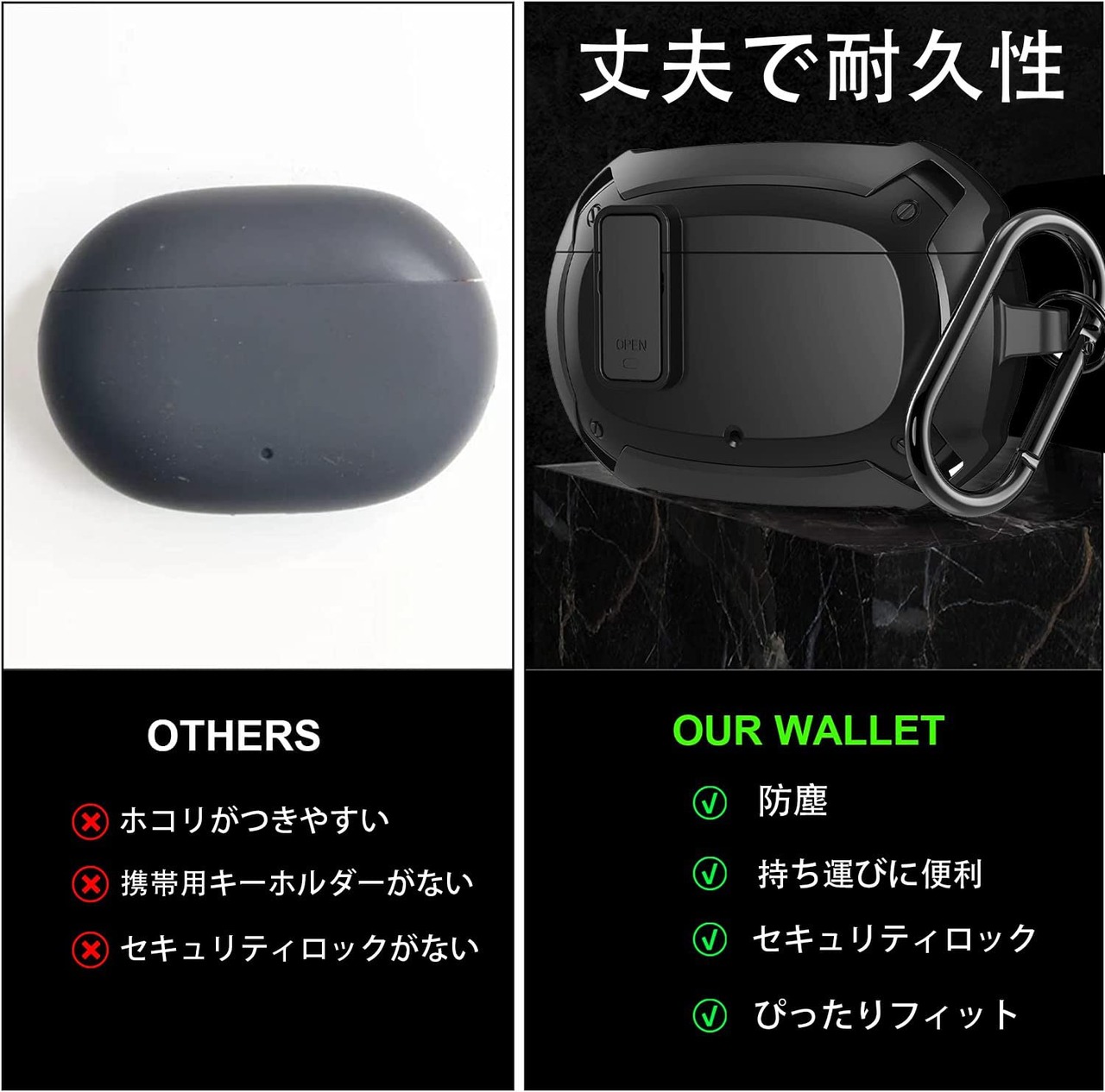 【ロック機能付き & 高品質TPU素材】このBeats Studio Buds + /Beats Studio Budsケースは、最新の安全ロック機能を採用しています。[open]キーを押した場合にのみ、Beats Studio Buds + /Beats Studio Budsを開くことができます。誤って開いたり、手から落としたりする心配がありません。ケースは高品質の柔軟なTPU素材で作られており、安全性と環境保護性があり、人の肌に刺激を与えません。汚れや指紋に強いだけでなく、キズに強いので、キーと一緒に置いてもキズの心配がありません。