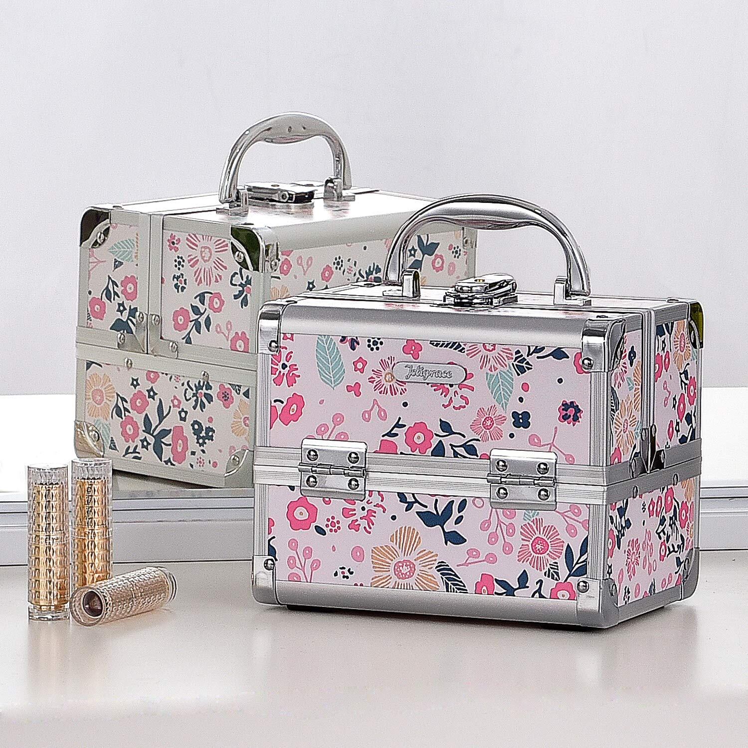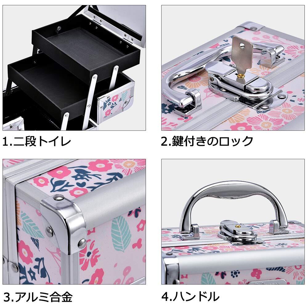 【新着商品】Hapilife メイクボックス 鏡付き コスメボックス 2段 スライドトレイ メイク用品収納 プロ仕様 小型 化粧箱 プレゼント フラワー柄 (ピンク)