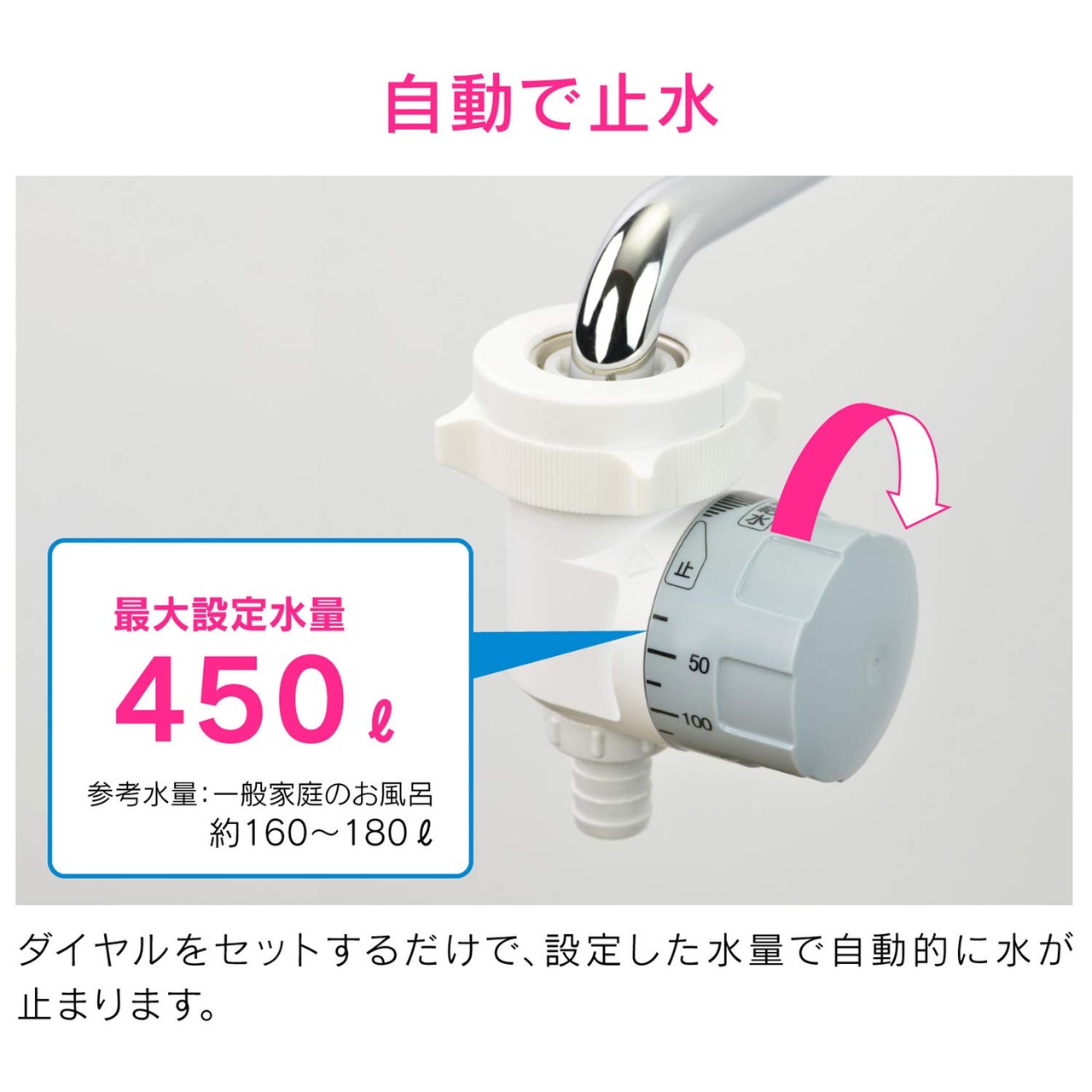 最大設定水量:450L、使用温度:1~50度、使用圧力:0.1~0.3MPa、材質:ABS樹脂、ポリアセタール
