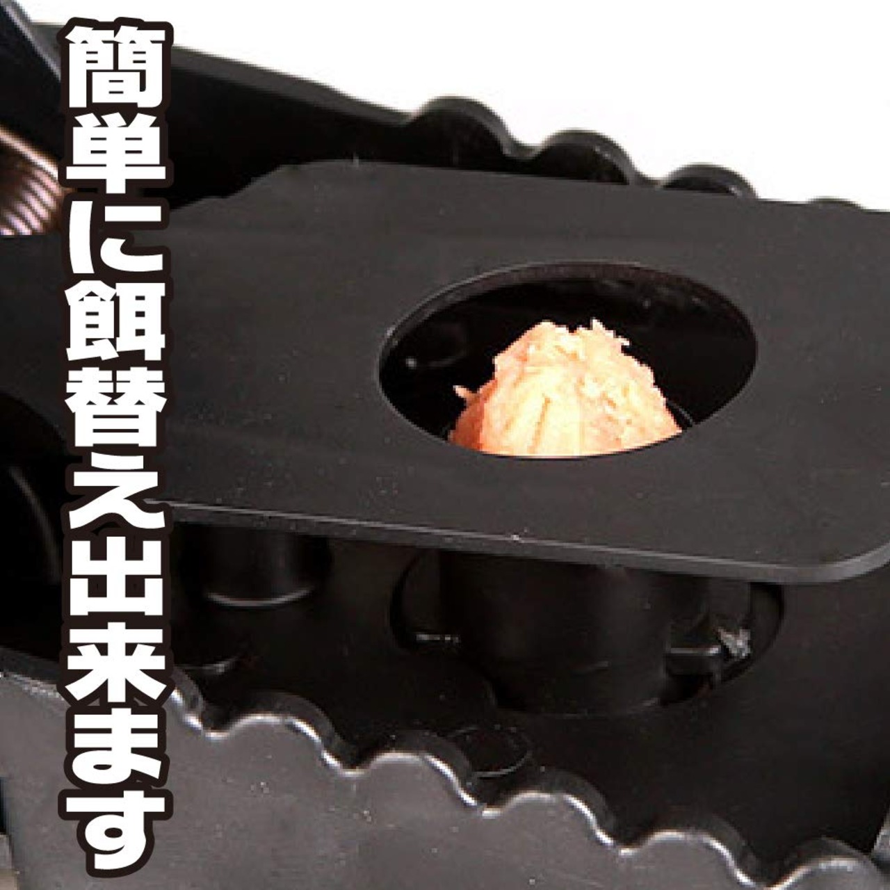 このねずみとり捕獲器の使い方は簡単、1.本体裏側のエサ入れにエサを置きます。2.フックに引っ掛けてセットします。※バネは強力なので、指を挟まないよう注意してください。3.ネズミが通ると思われる狭い箇所に設置し完了。捕らえたネズミは、触れることなく処分することができます。