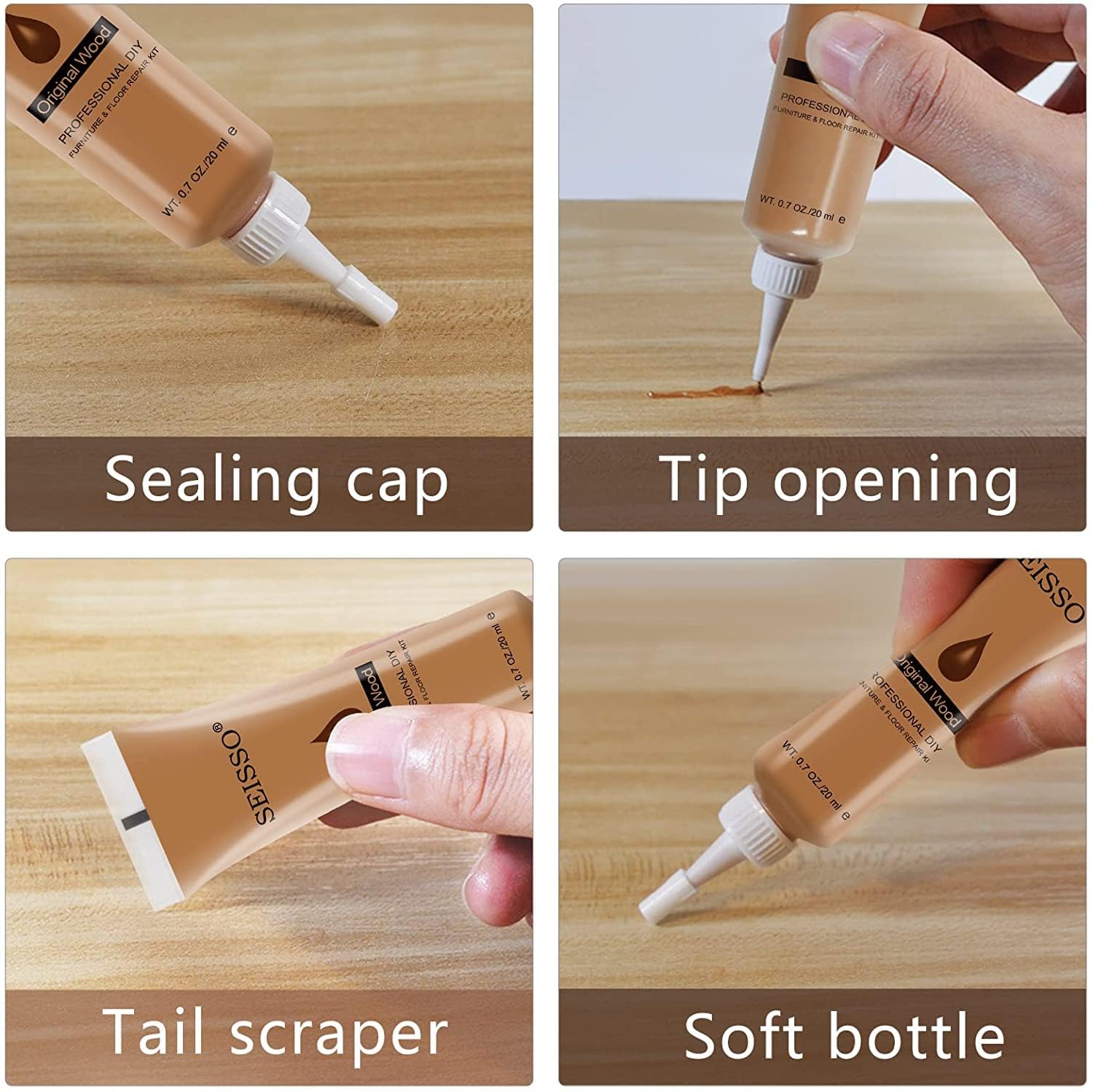 【フラット形状のテール*便利補修】▲チューブのテール部分はフラット形状になっており、スクレーパーとして使えるので、他のツールを使わずにフラット形状のテールで修復クリームを滑らかにするだけでよいです。このキズ補修クリームはフローリングや家具にできた小さなキズを自分で補修できる便利なツールです。