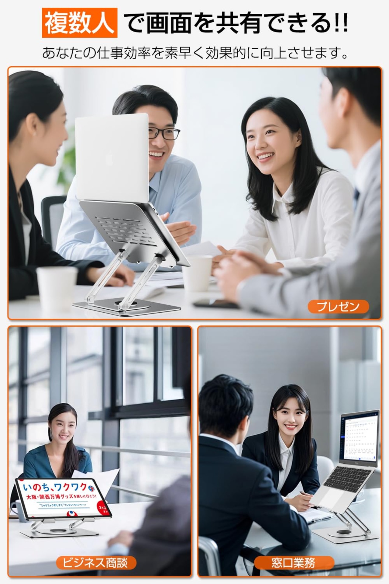 【360度回転&180°角度調整2ヶ所】ZEEKK パソコンスタンドはお使いの使用状況に応じて、ツール不要で天板をくるっと自由に360度回転できます。180°調整が2ヶ所あり、高さ・角度も多段階調節可能です。同僚とデータを議論する際にスタンドを移動する必要がなく、回転するだけで向かい合う相手と簡単に画面を共有できるので、家族で映画を見たり、オフィスでの会議やプレゼンテーション、在宅デスク作業などに最適なノートパソコンスタンドです。