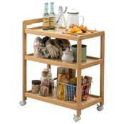 シンプルで使いやすいキッチンワゴン。キッチン周りの小物や調味料等がまとめて収納できます。収納スペースの高さが2種類あるので高さがあるものもスッキリ収納。キャスターが付いているので移動もラクラク。ストッパーも付いているので固定も簡単にできます。また、一般的なダイニングテーブルと同じくらいの高さなので、サブテーブルとして活用することも可能です。さらにシンプルなデザインだから、ランドリーやデスク周りでもご使用いただけます。【商品サイズ(約)】幅59×奥行34×高さ73cm【重量(約)】6kg【素材】天然木【表面加工】ラッカー塗装【生産国】ベトナム【備考】家具の上に加熱したなべ・やかん等を直接置かないでください。