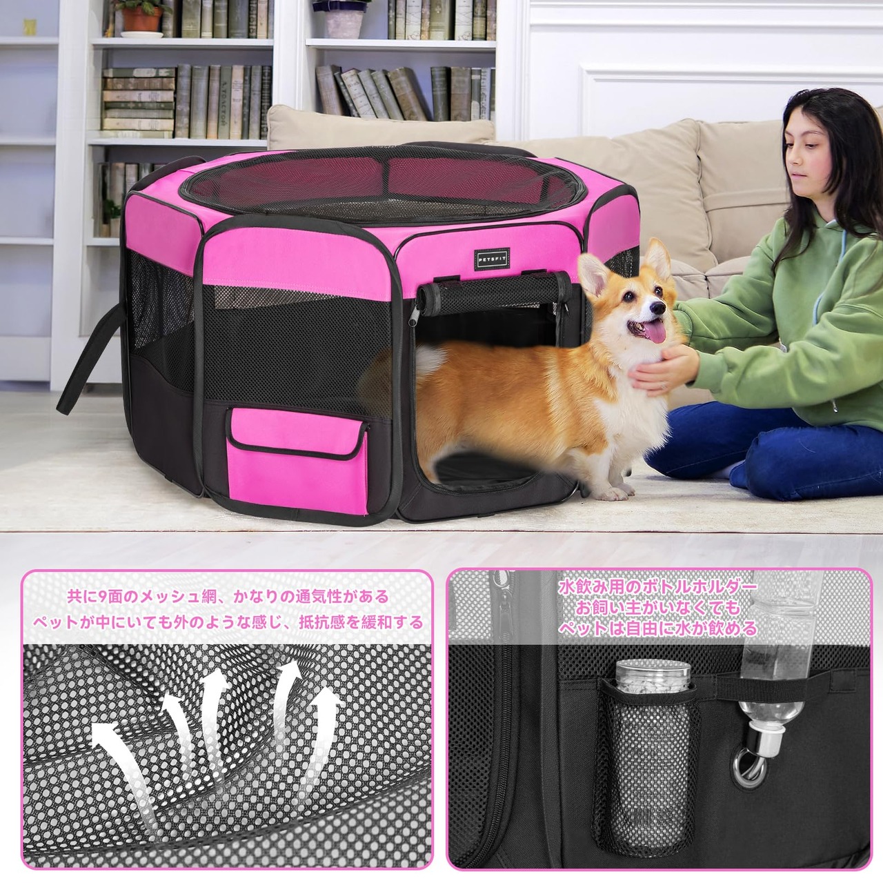 【新着商品】Petsfit 犬 サークル ペットサークル 八角形 ドッグハウス 【パッと開いてすぐ使える】 猫の産屋 猫の分娩室 折りたたみ 犬猫兼用 メッシュ 屋根付き 軽量 収納バッグ付き 部屋のインテリアに馴染み キャンプ アウトドア お出かけ用品 中小ペット (Mサイズ ピンク)