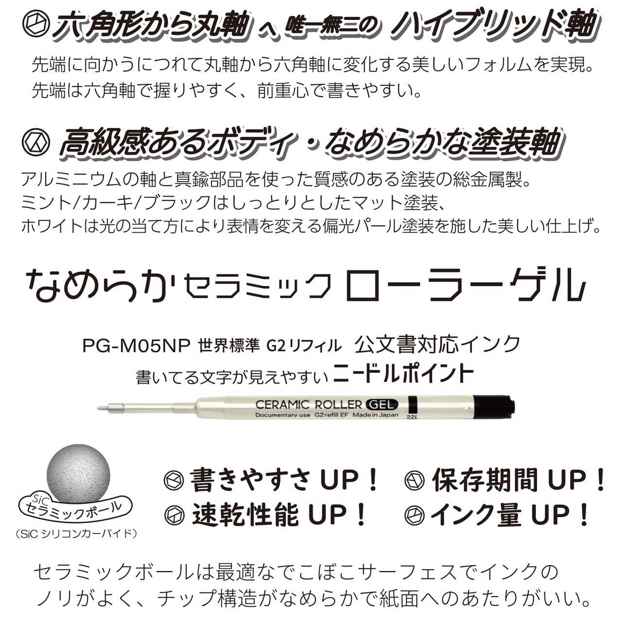 先端に向かうにつれて丸軸から六角軸に変化する美しいフォルムを実現。先端は六角軸で握りやすく、前重心で書きやすい。アルミニウムの軸と真鍮部品を使った質感のある塗装の総金属製。 ミント/カーキ/ブラックはしっとりとしたマット塗装、ホワイトは光の当て方により表情を変える偏向パール塗装を施した美しい仕上げ。