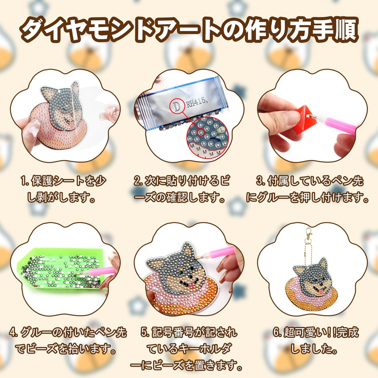 【ダイヤモンドアートキーホルダーパッケージ内容】 高品質樹脂犬セットx8、金属キーホルダーチェーンx8、カラフルなダイヤモンドx1、ビーズトレイx1、ダイヤモンドペンx1、接着剤x1。完成したダイヤモンドアートは財布・キーペンダント・バッグなどに装飾することができ、きれいな装飾品になります。自分で手作りのプレゼントは、家族や友人にとって非常に意味があります。