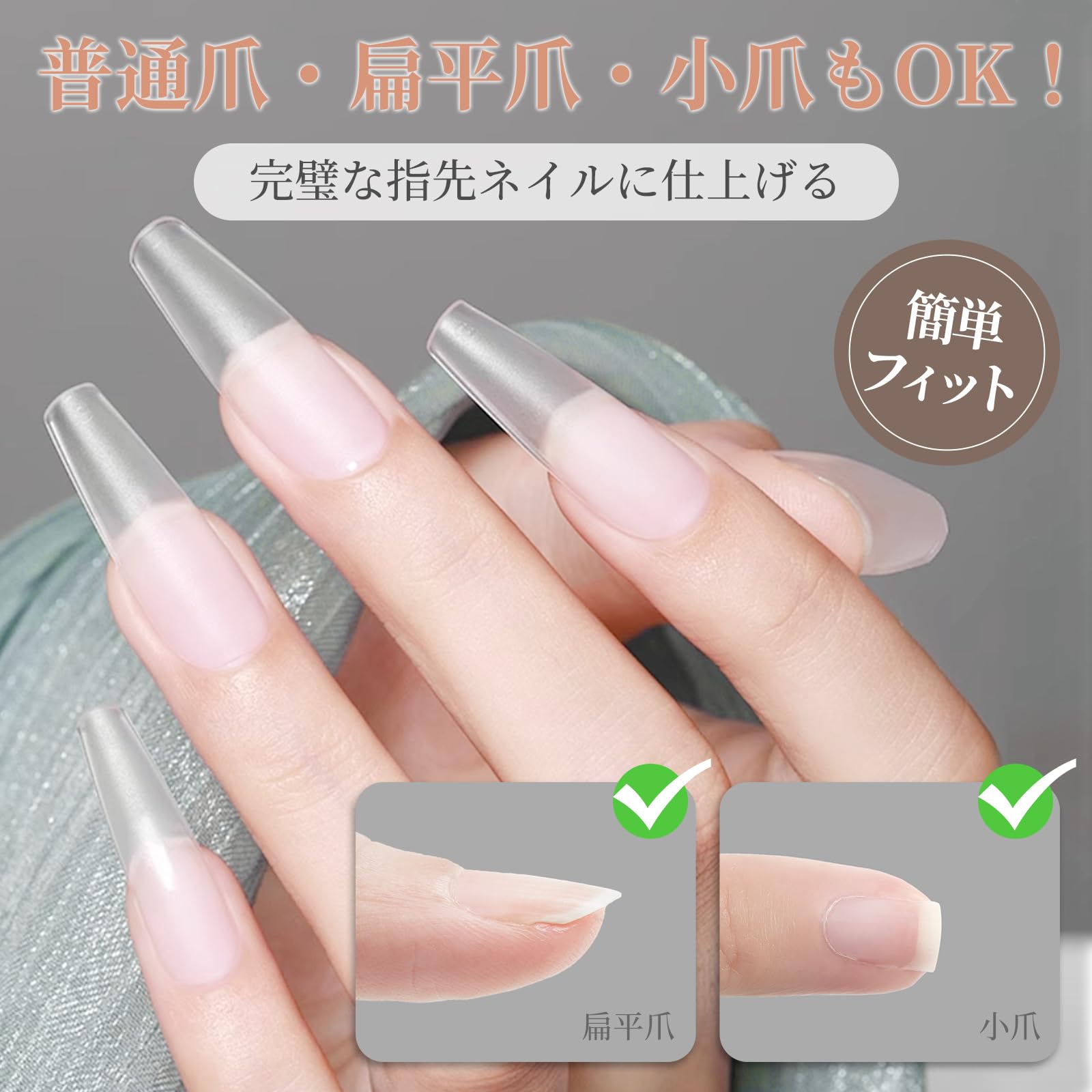 【業界トップクラスの驚異的な薄さ!】長さだしチップは全体的に非常に薄く、特に爪の根元は約0.2mmの超薄型設計。まるで自爪のような軽さとフィット感で、装着を忘れる快適さを実現。段差もほとんど感じられず自然な仕上がりです。面倒な下処理不要のサンディング済みで、驚きの薄さをぜひ体感してください。